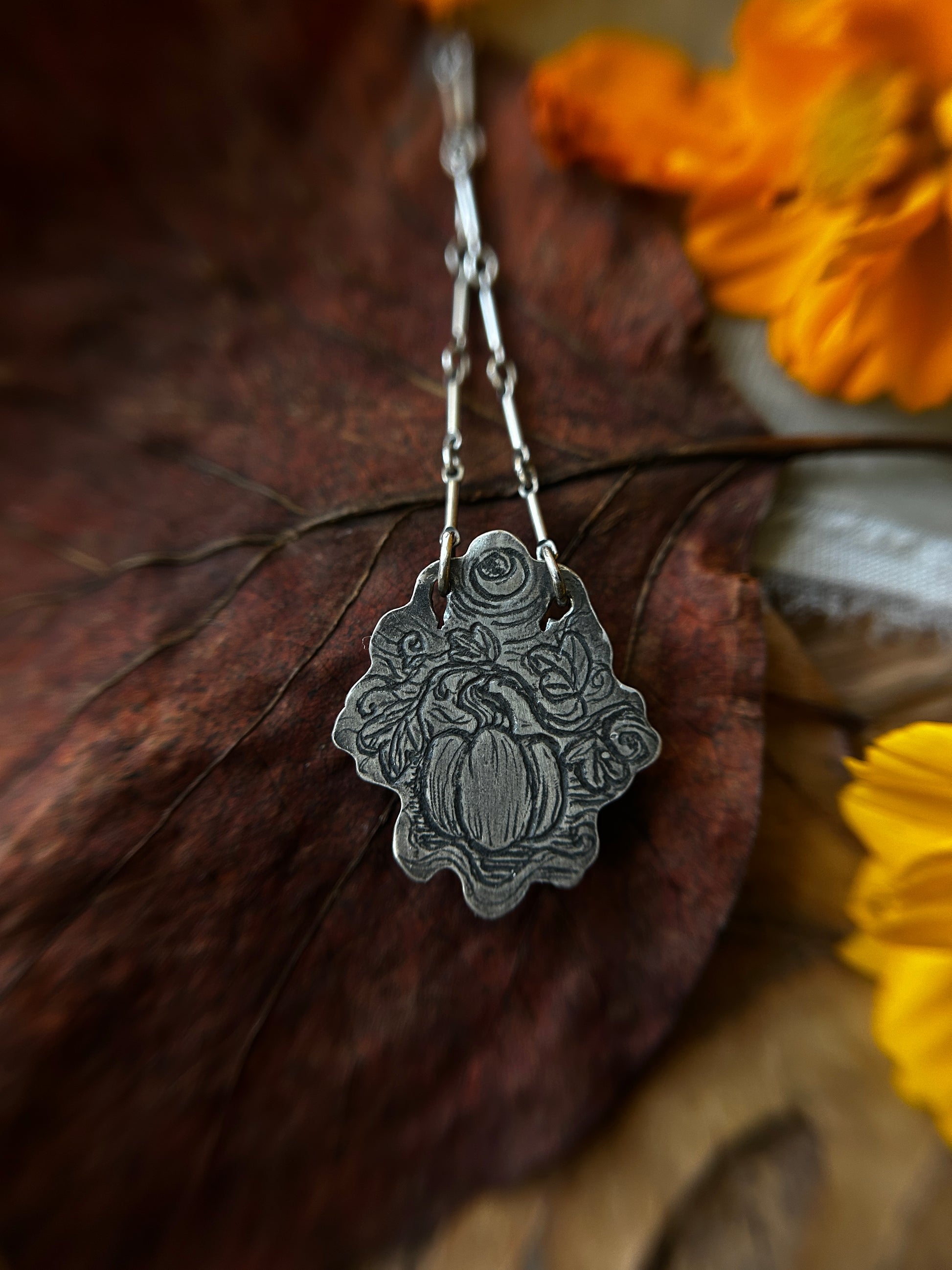 An ode to the jack-o-lanterns that illuminate the shadowy night of Halloween. This necklace features a stunning portrait cut geometric shaped santa ana madiera citrine in the deepest shade of golden yellow. Underneath is a pumpkin jack-o-lantern sawed and carved by hand. Twirls of pumpkin vines encircle the stone, with black star sapphires encircling it. The back of the pendant features a pumpkin engraving. Crafted entirely from sterling silver by hand and flame.