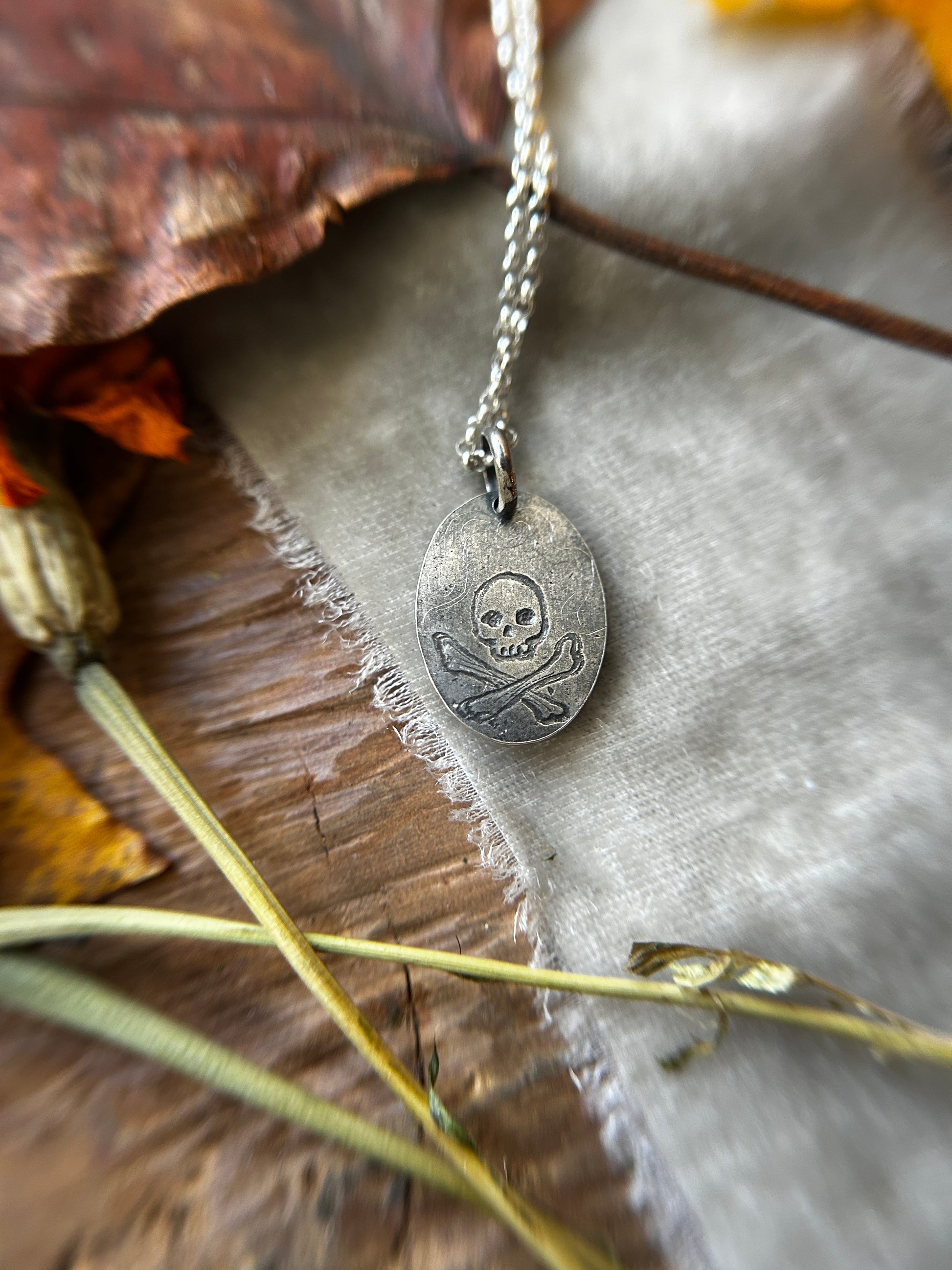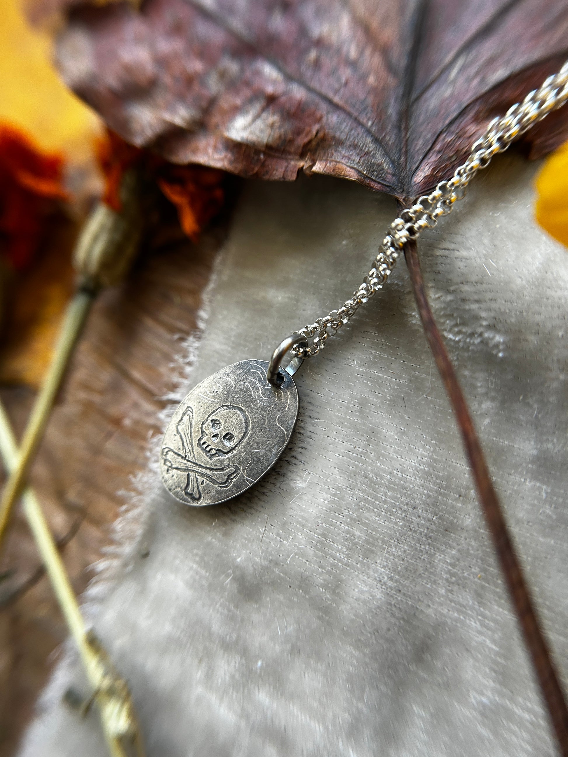 This necklace features a hand-sawed and engraved belladonna flower on a hammered sterling silver pendant. A black star sapphire decorated the pendant, while the back of the pendant is engraved with a skull and crossbones.