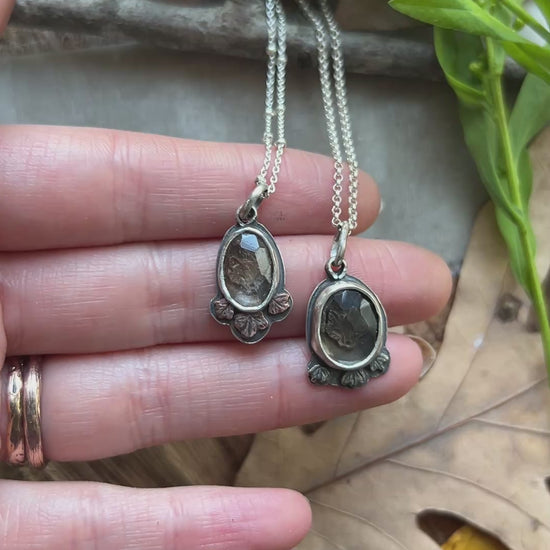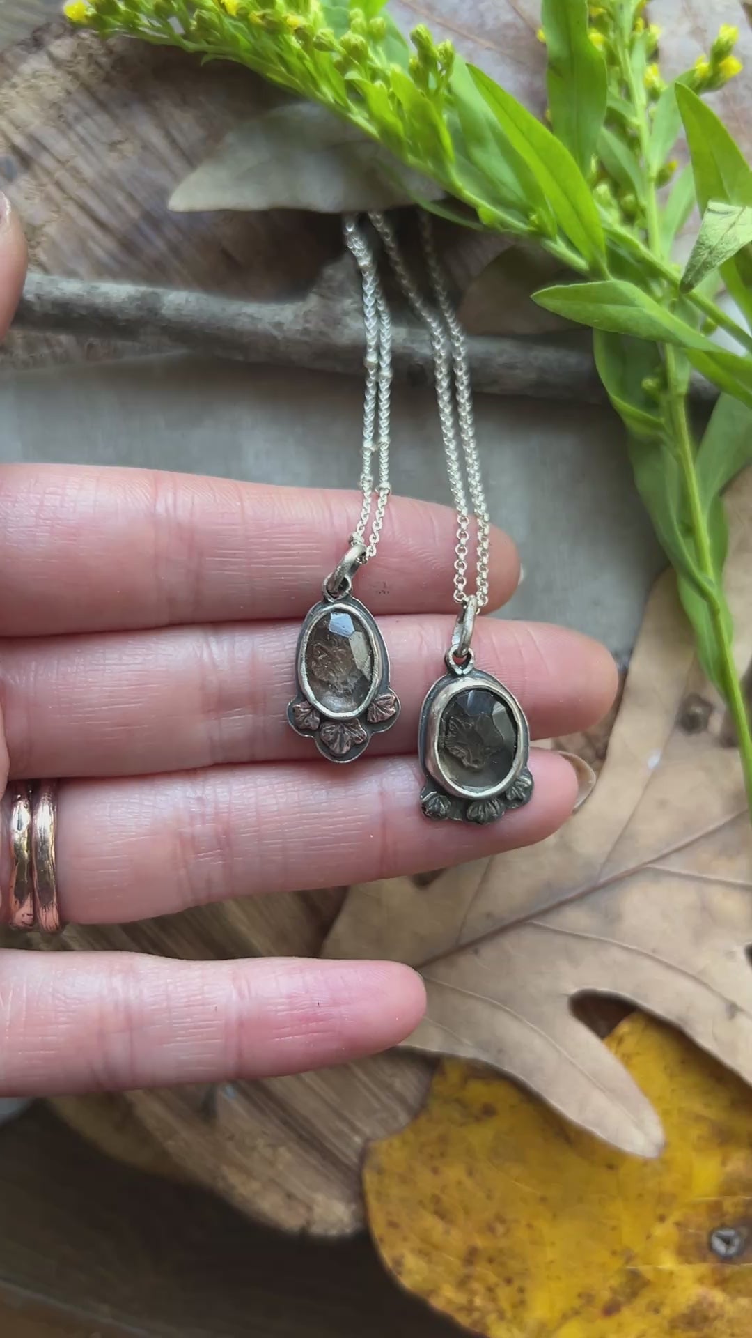 The other necklace is made with a smoky quartz, and all sterling silver. It is a clearer stone, but a darker hue so sometines the fox is hidden depending on light.