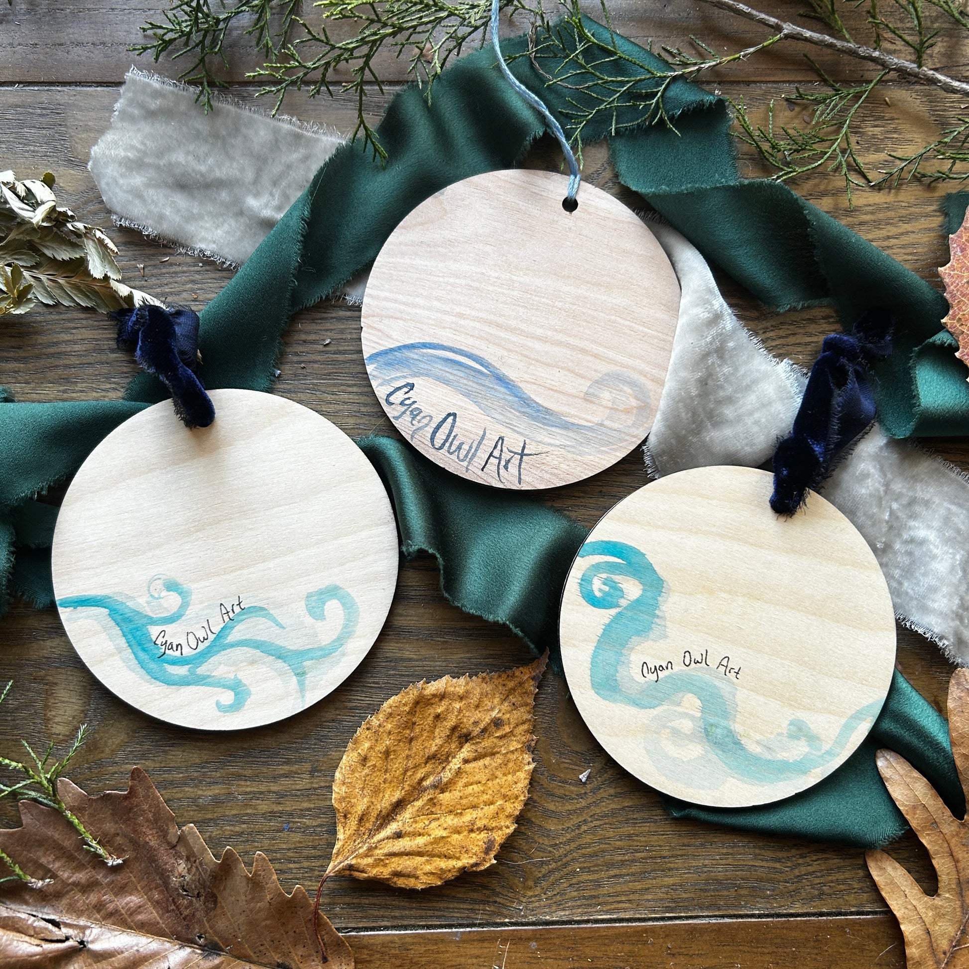 Each ornament is sealed with a UV protectant gloss varnish, and ready to place on a tree (or wherever) with a velvet ribbon or a blue cotton twine.