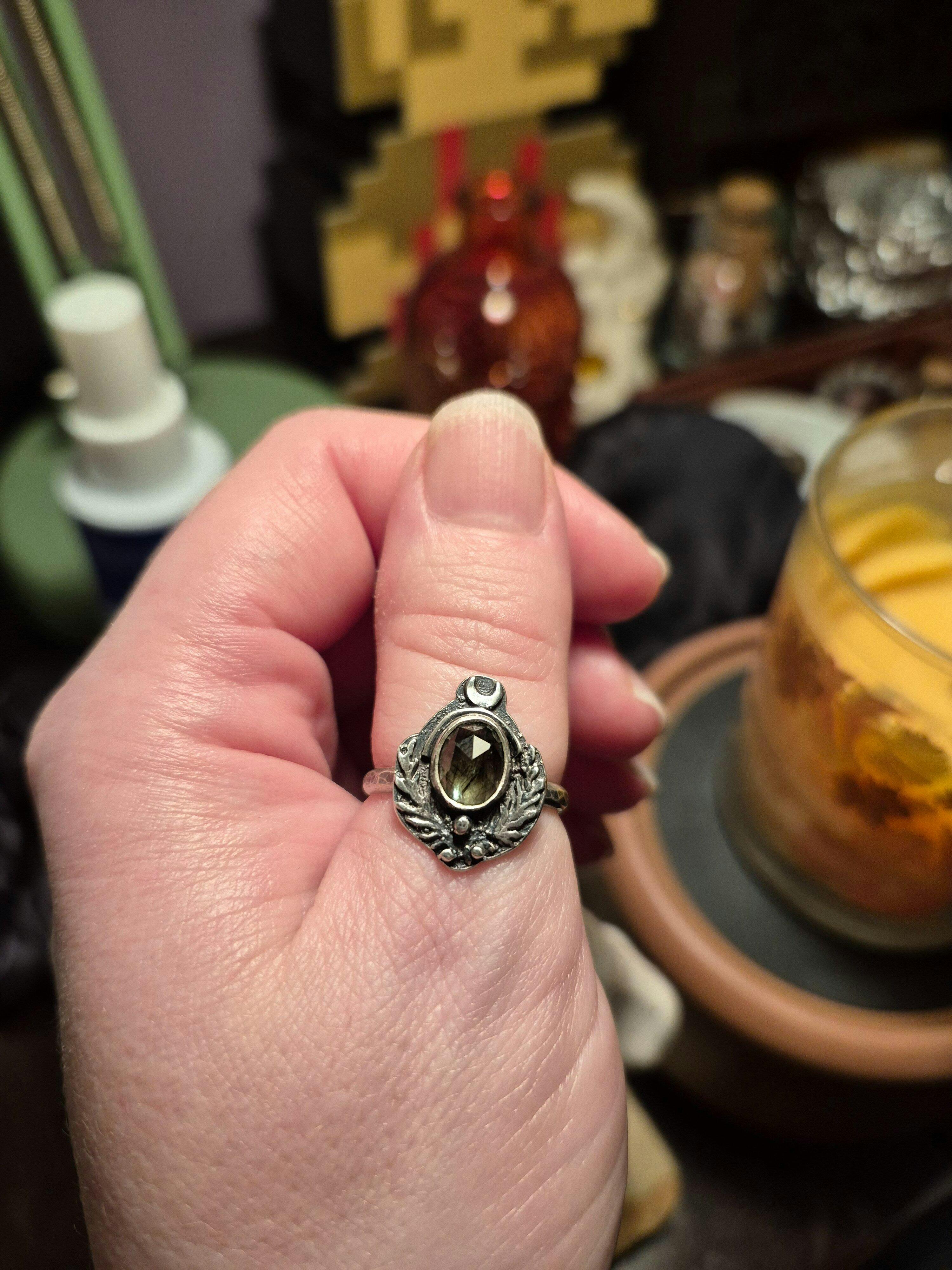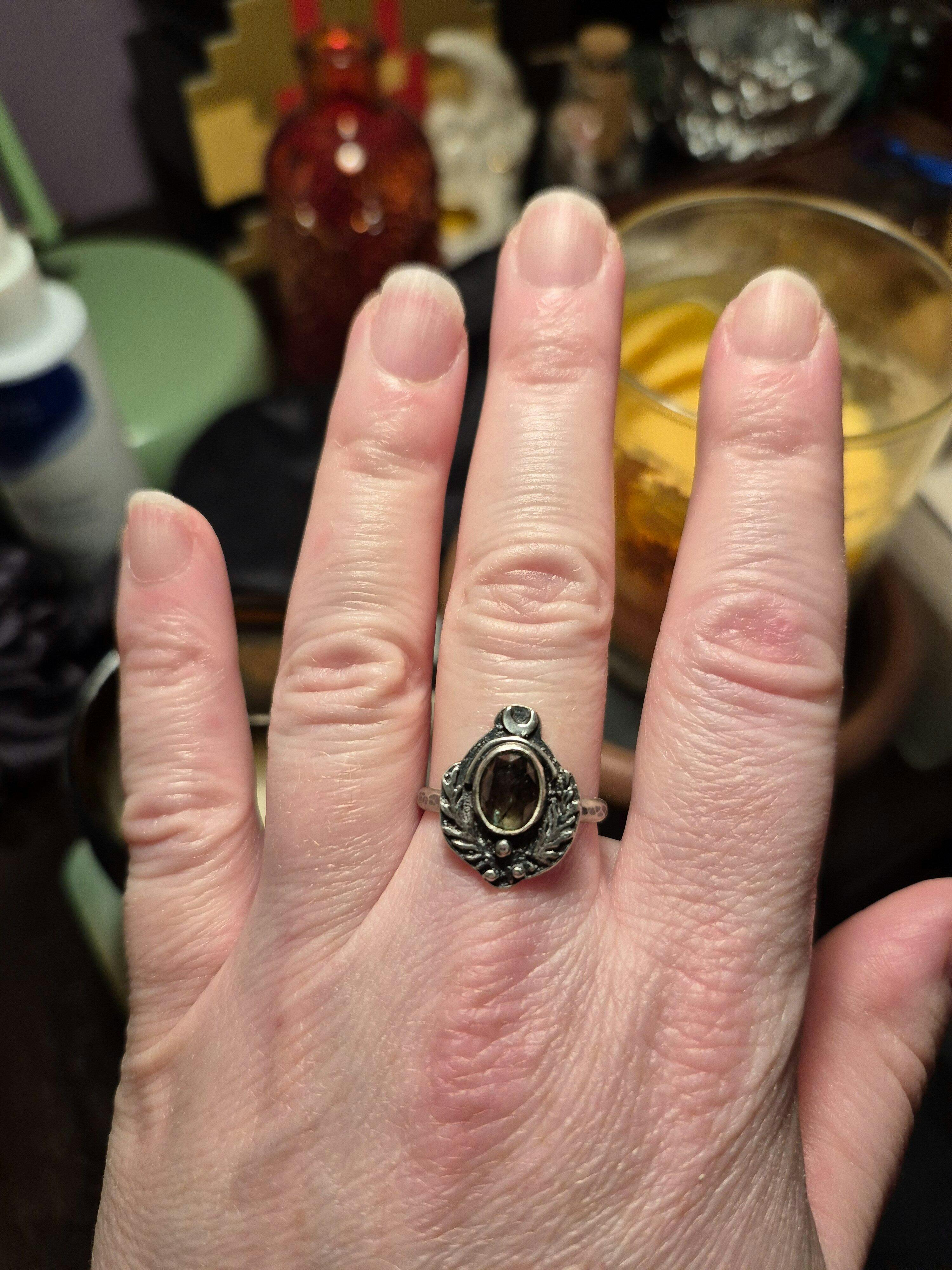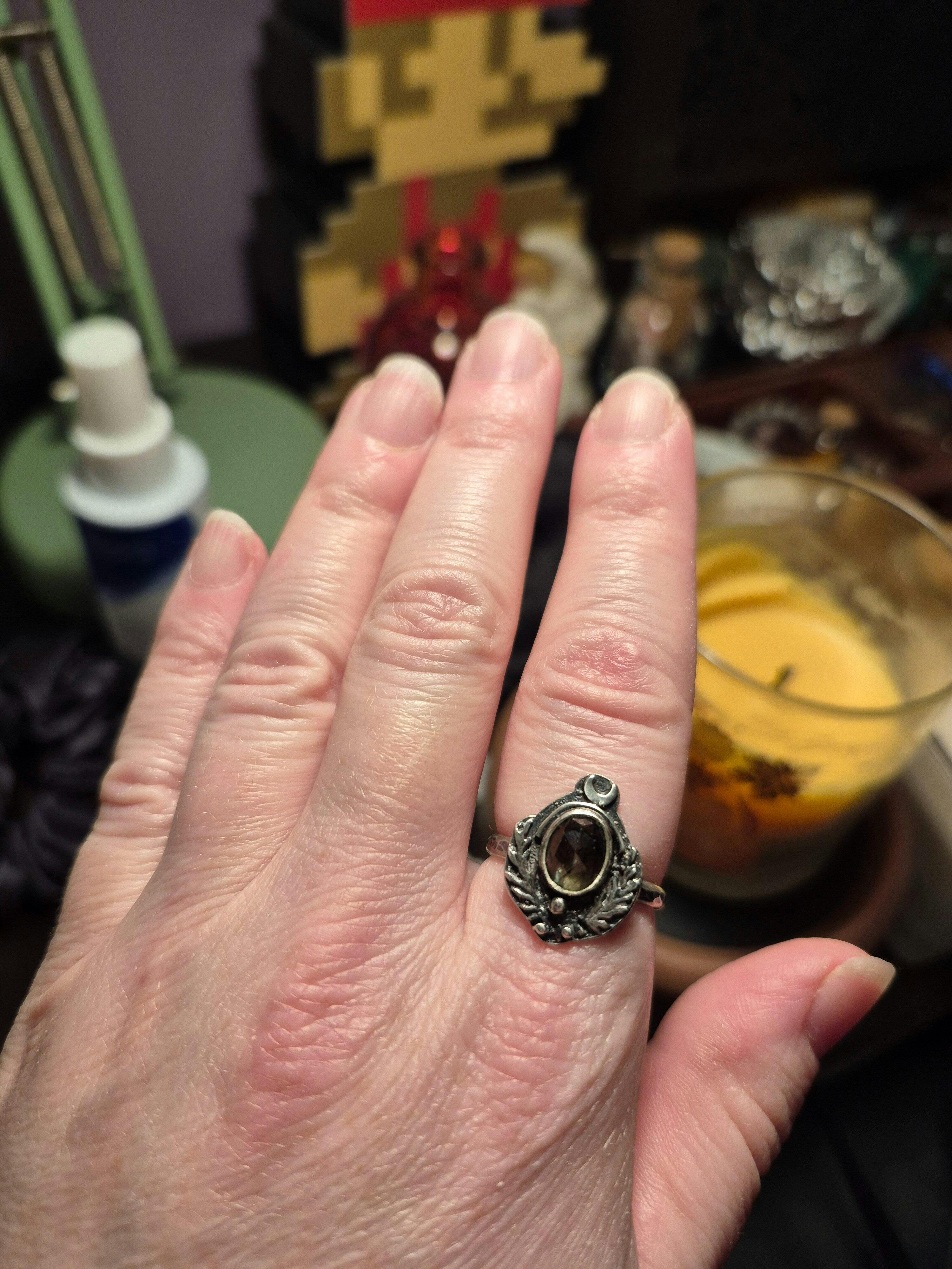 This ring is gorgeous. I cannot emphasize that enough. It also happens to fit perfectly on my thumb, index, and middle fingers, which is a huge plus because I like having options with my accessories. The ring itself is very well made and was customized to the size I requested (size 9). It also happened to arrive much sooner than expected considering that it was a semi-customized item. I had been following this particular blacksmith for awhile now and am very excited to finally own a few pieces of hers. I will definitely be back to get more sometime in the future. If you are thinking about making a purchase, just do it! ❤️