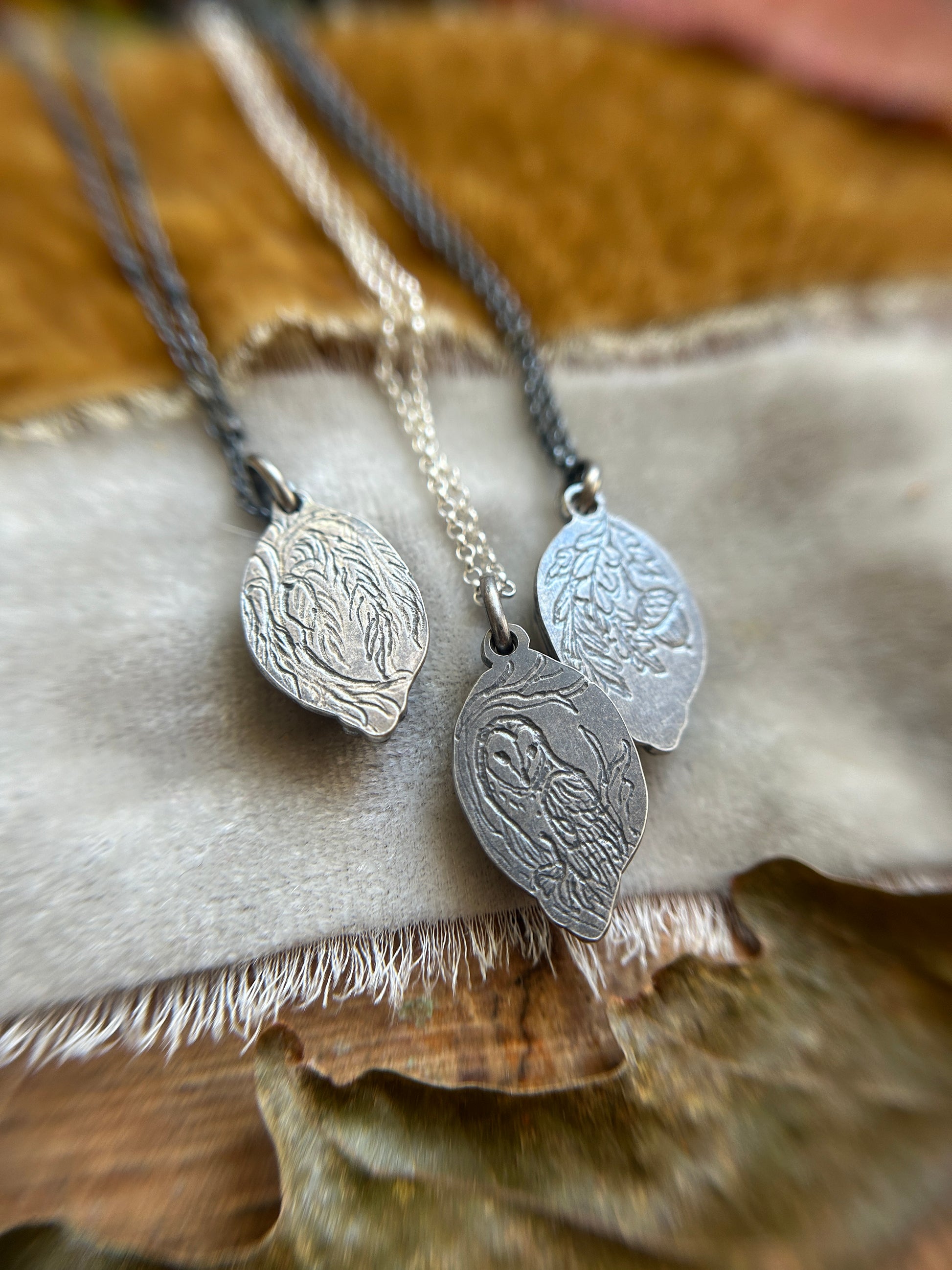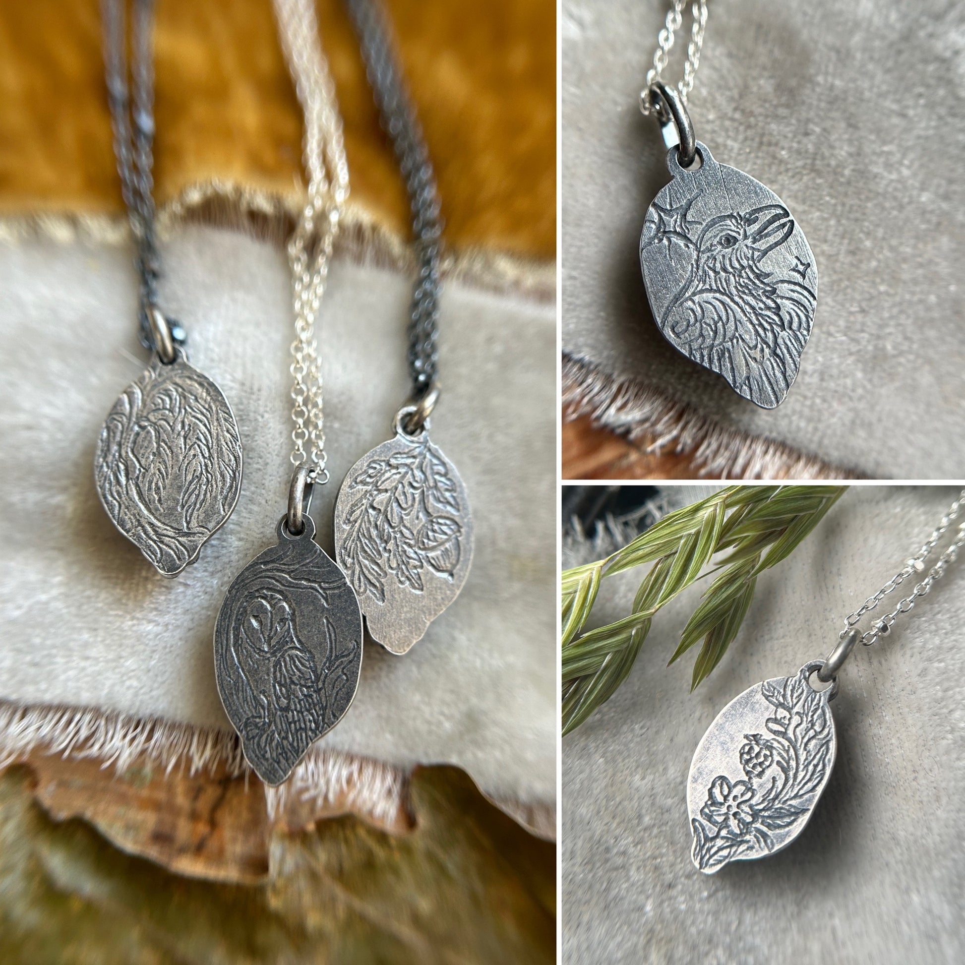 this is for one custom made to order skull necklace, with a back engraving of your chosen plant or animal. I’ve shown a few different past designs I’ve made. The classic standard is a weeping willow urn motif.