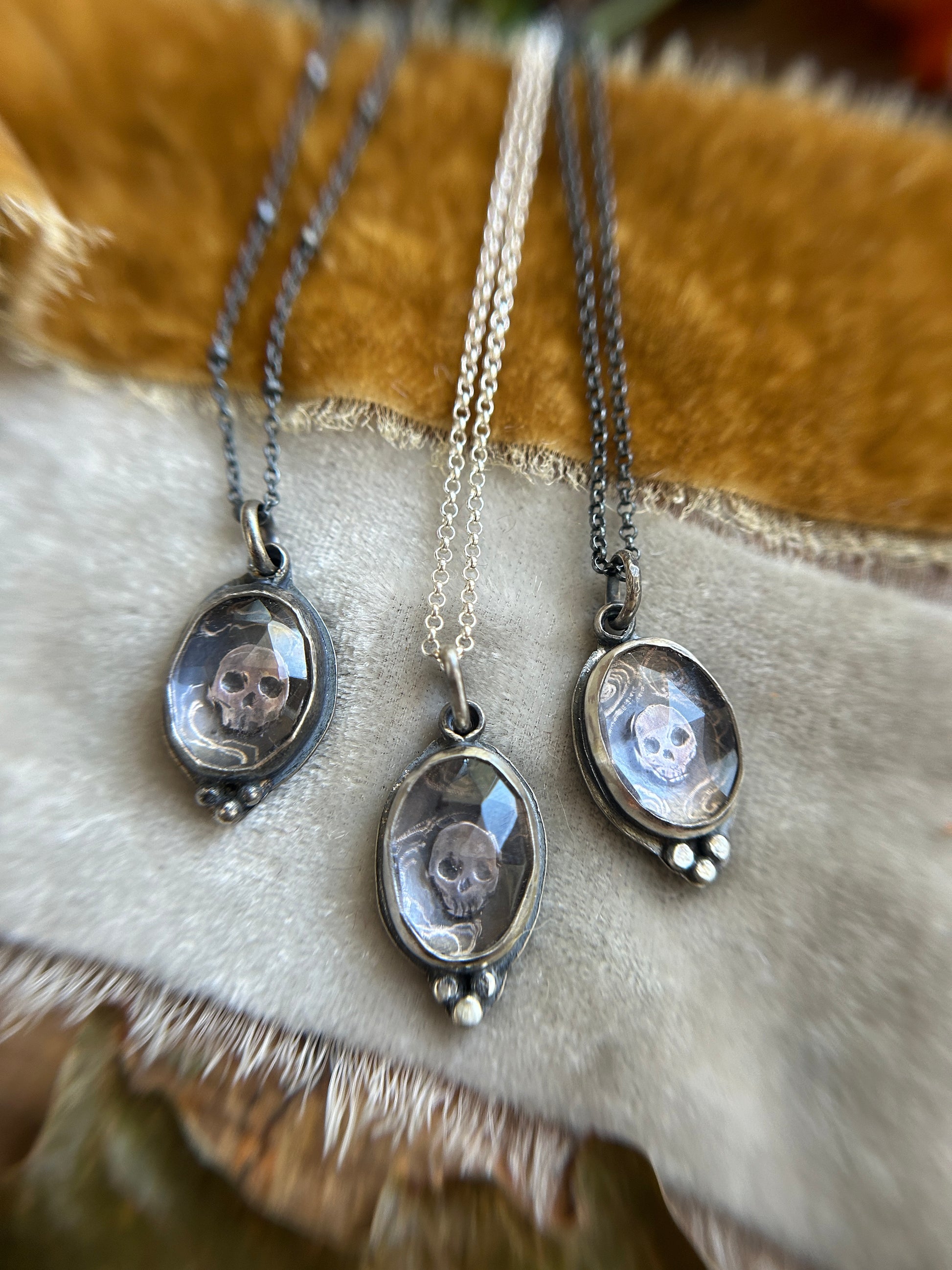 Each necklace features a faceted pale purple amethyst with a hand engraved skull under the gemstone, which creates a portal to the shadowy resting place of this skull. Each pendant features its own unique engraving on the back. The silver pebbles dotting the bottom of each of the necklaces are reclaimed silver from my other projects.