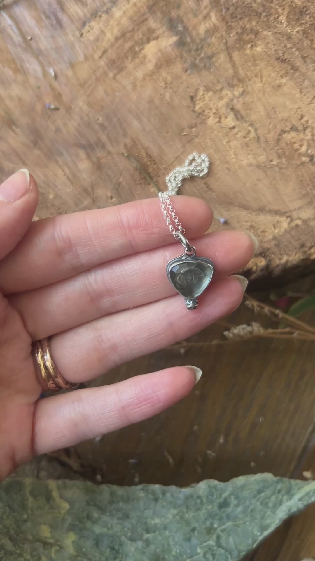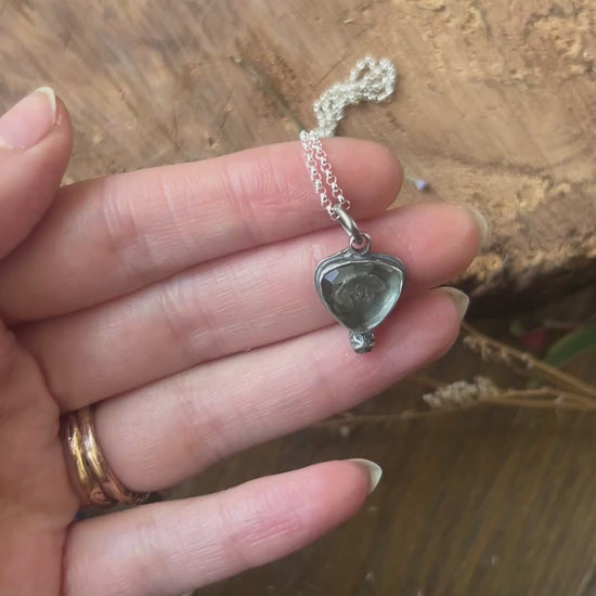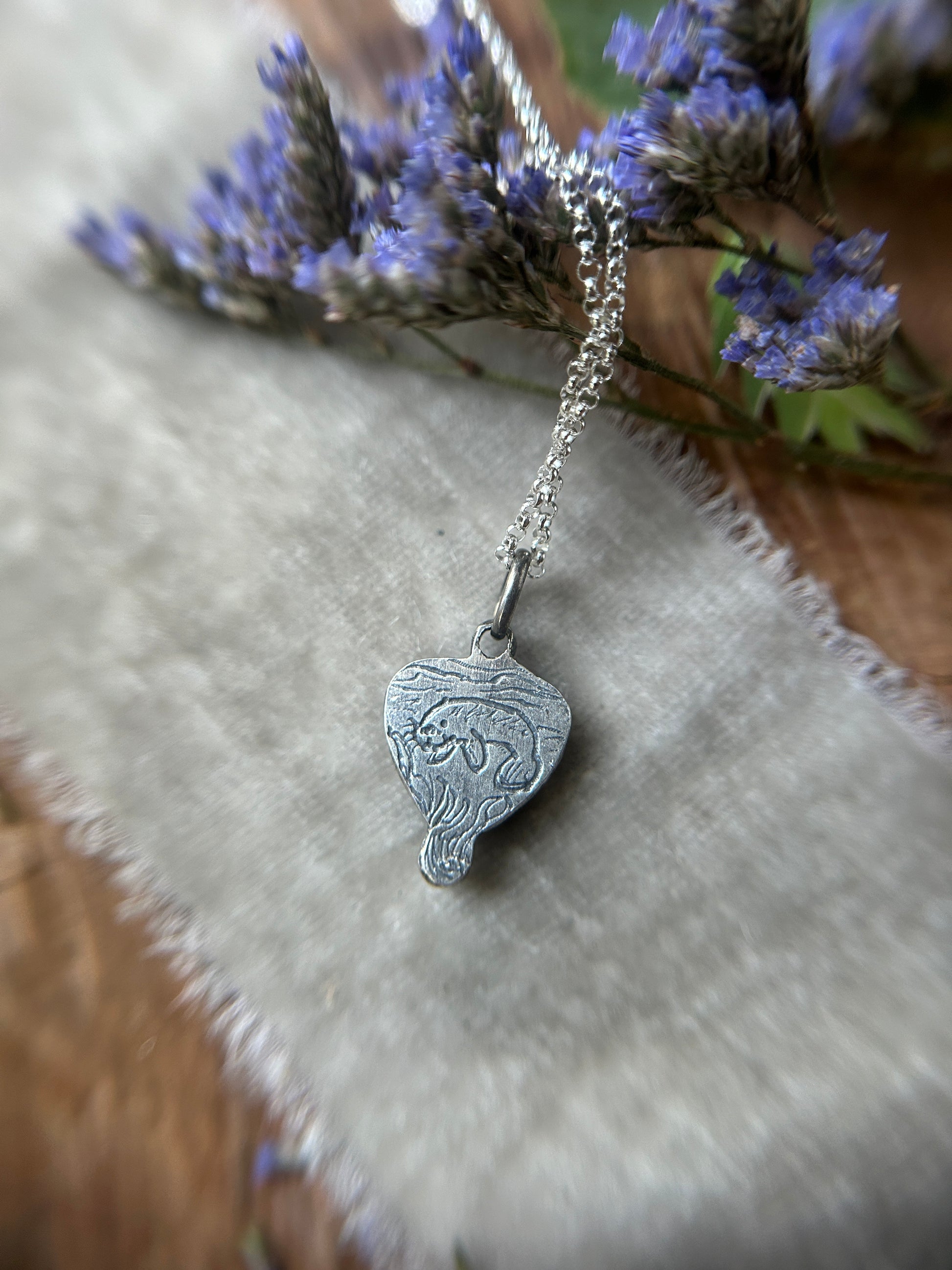 Of the water dwelling creatures, a manatee seems like it could be the perfect friend to the selkie seals (though preferring the warmer waters). This necklace features a miniature version of a manatee, sawed out by hand and engraved, underneath a pale green amethyst gem. A reclaimed silver pebble decorates the bottom of the pendant. The back has a manatee swimming underwater with seaweed growing.