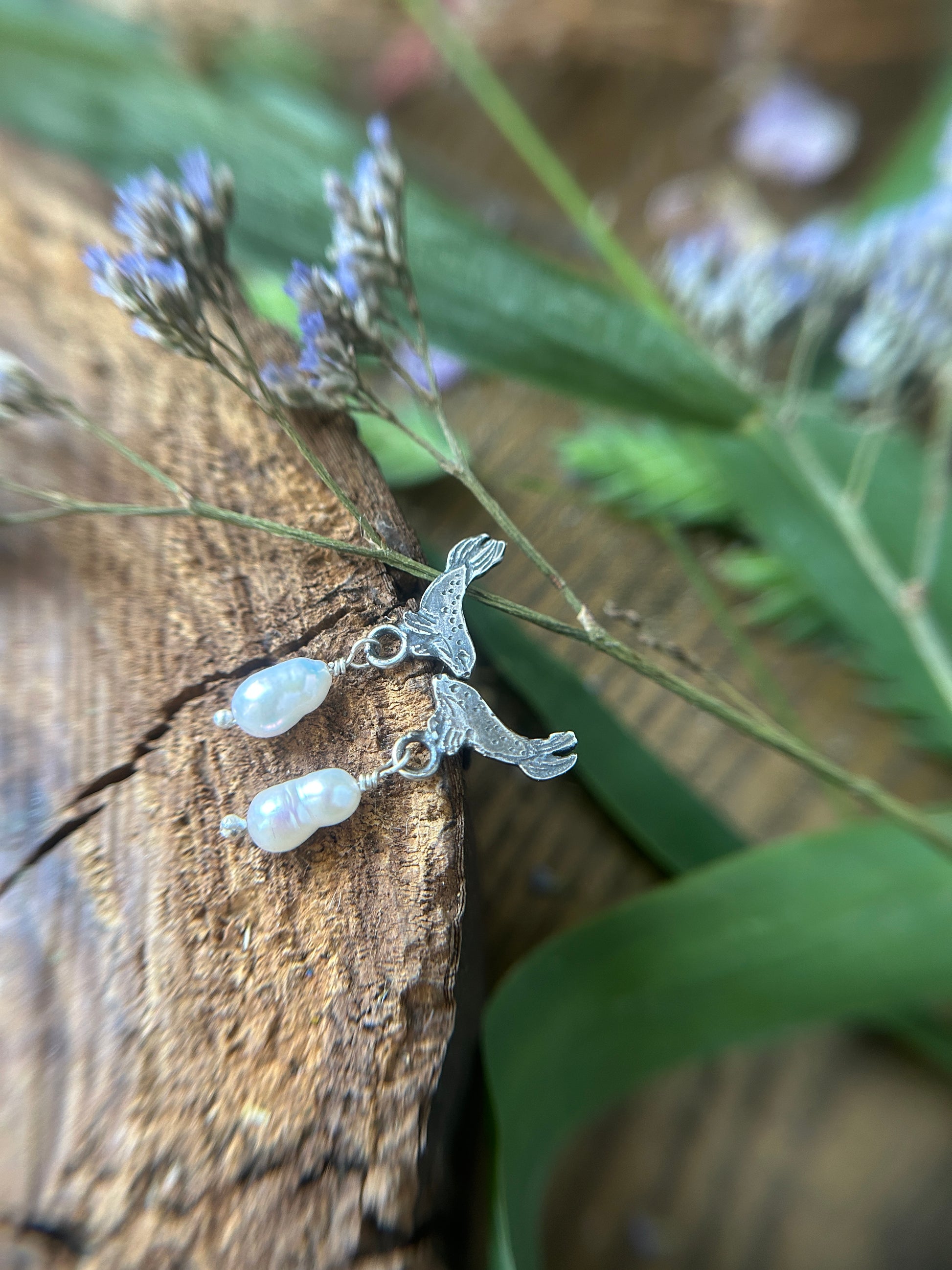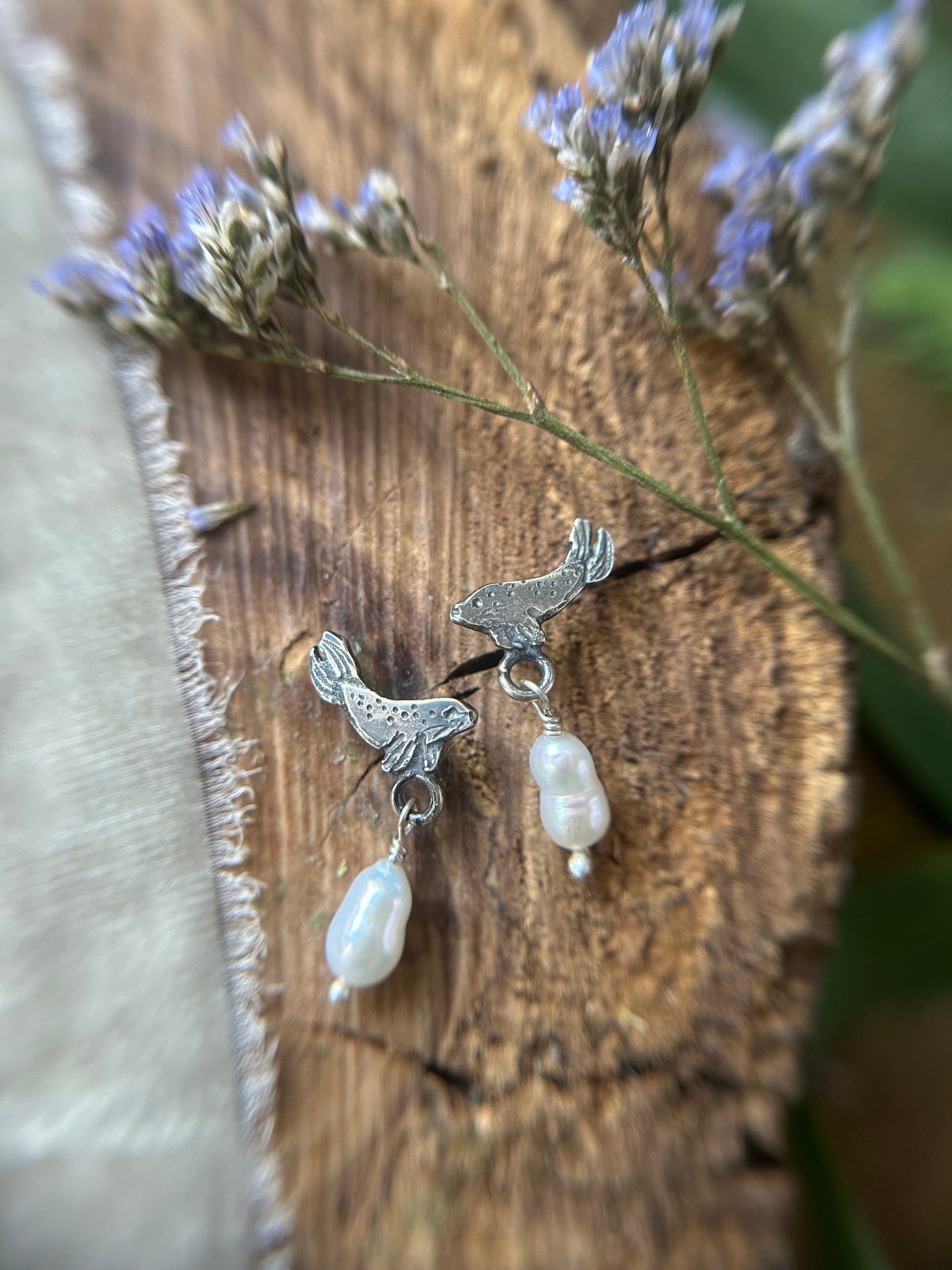 Small selkies to grace your ears, and take the sea where ever you go. These seals are sawed by hand and engraved for details. Each seal holds a mini baroque pearl drop.