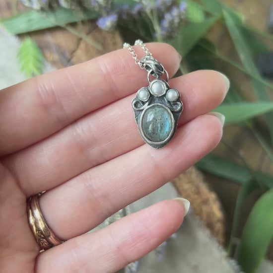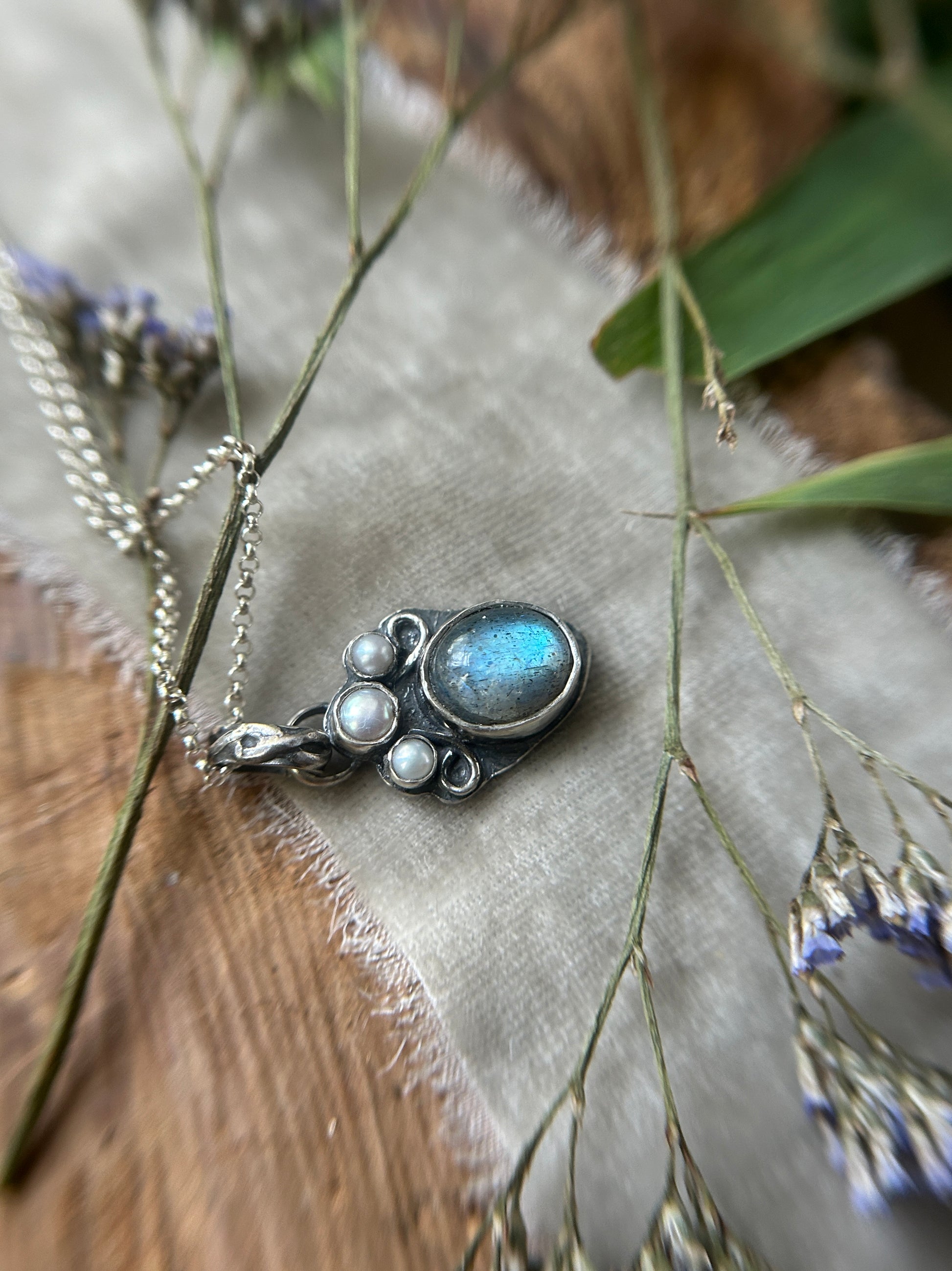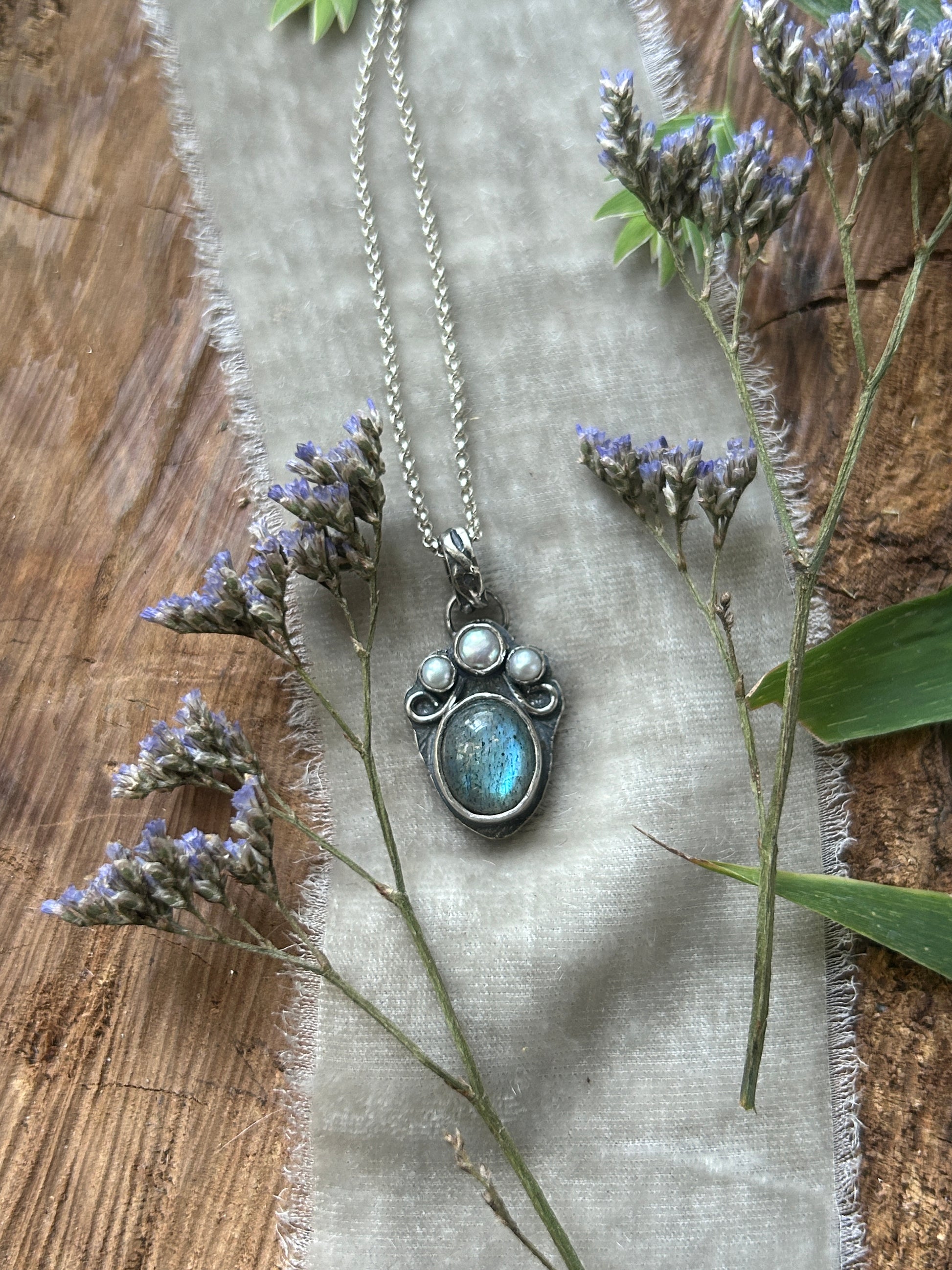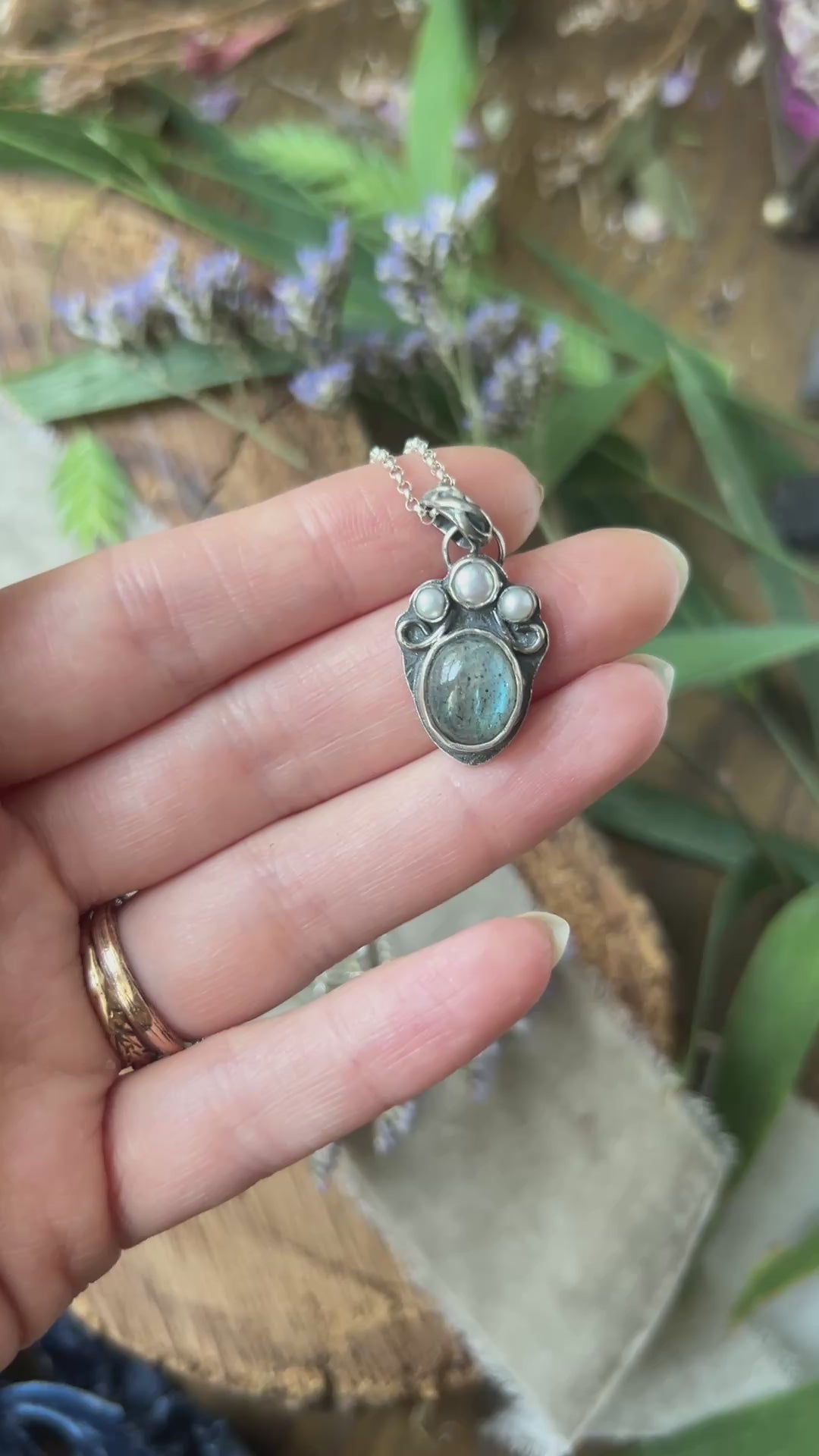 This necklace is inspired by some of the antique crowned heart necklaces (despite the labradorite stone being an oval instead of a heart shape, the sentiment is there). The labradorite stone flashes from seaside green to blue, and it is crowned with 3 freshwater pearls. Watery swirling details wrap around the stone.