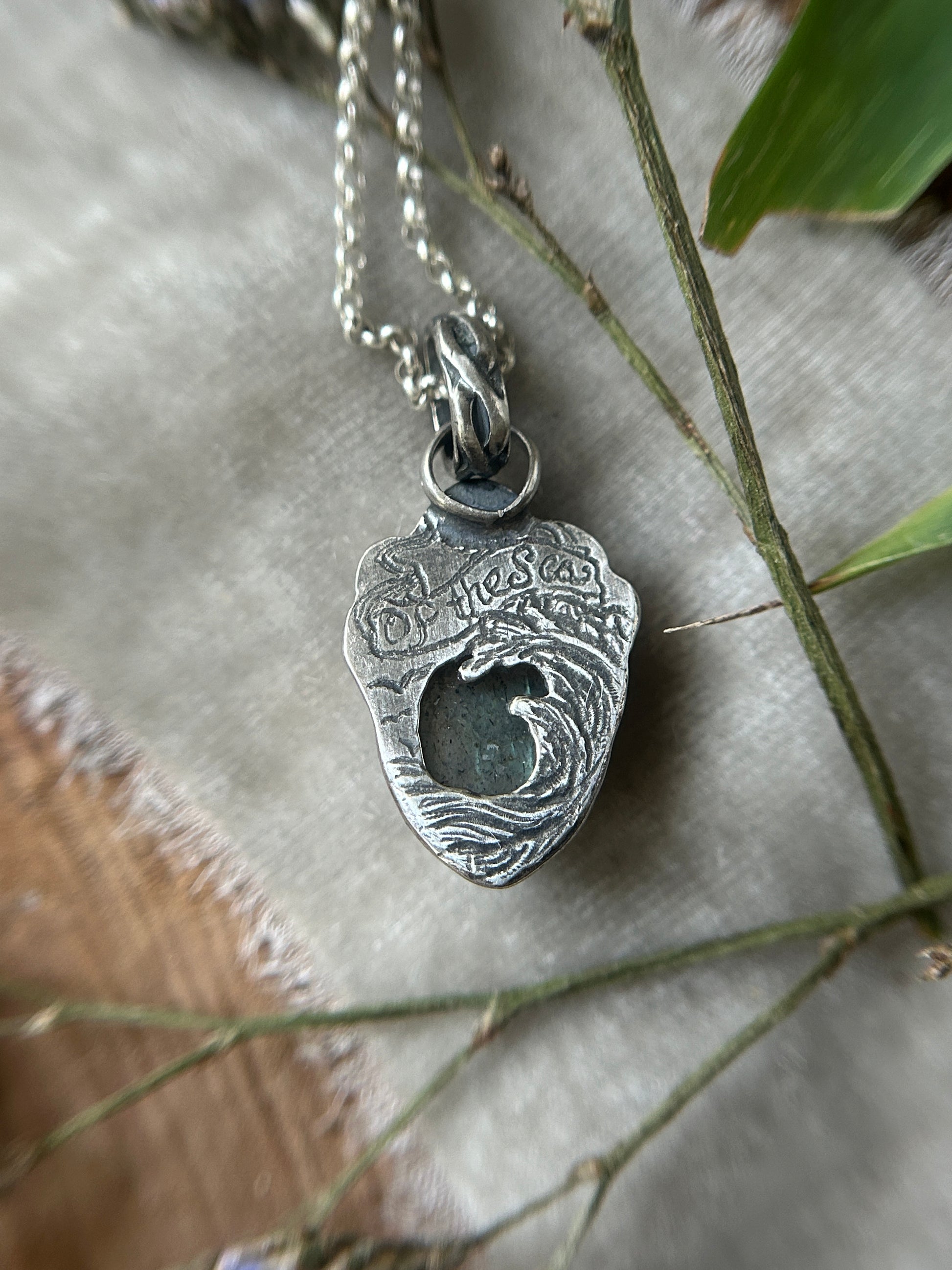 The back features a cut out to view the labradorite, with waves, gulls, and an antique ribbon banner declaring "of the sea".