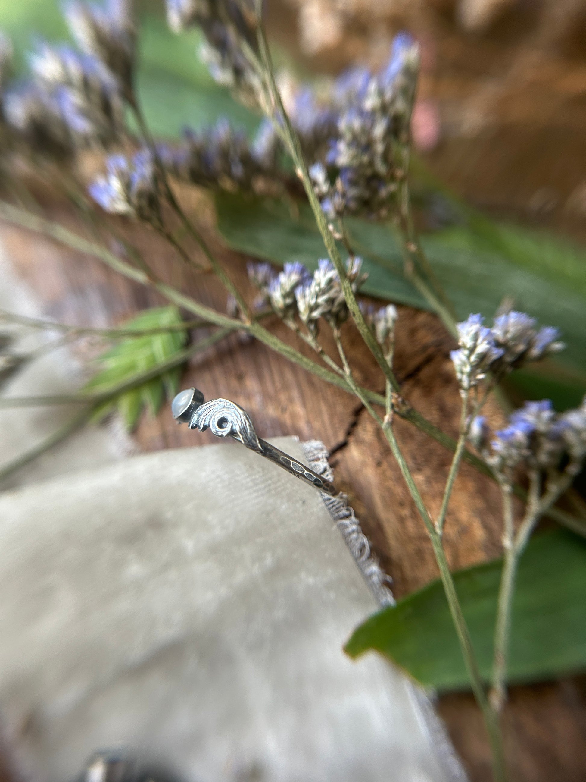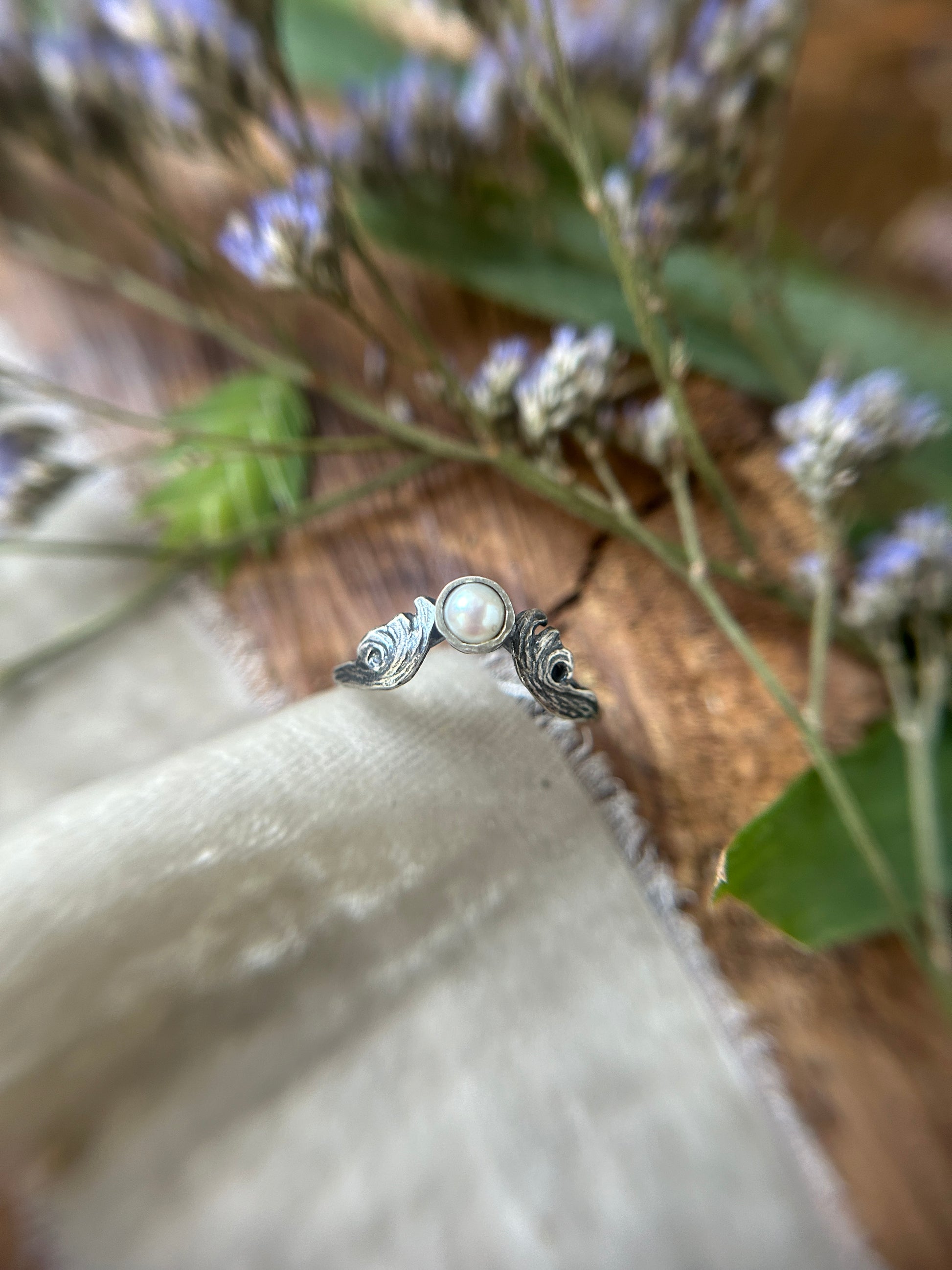 Each stacking ring is hammered for details, and given two engraved swirling ocean waves to frame your chosen gem, whether pearl or stone.