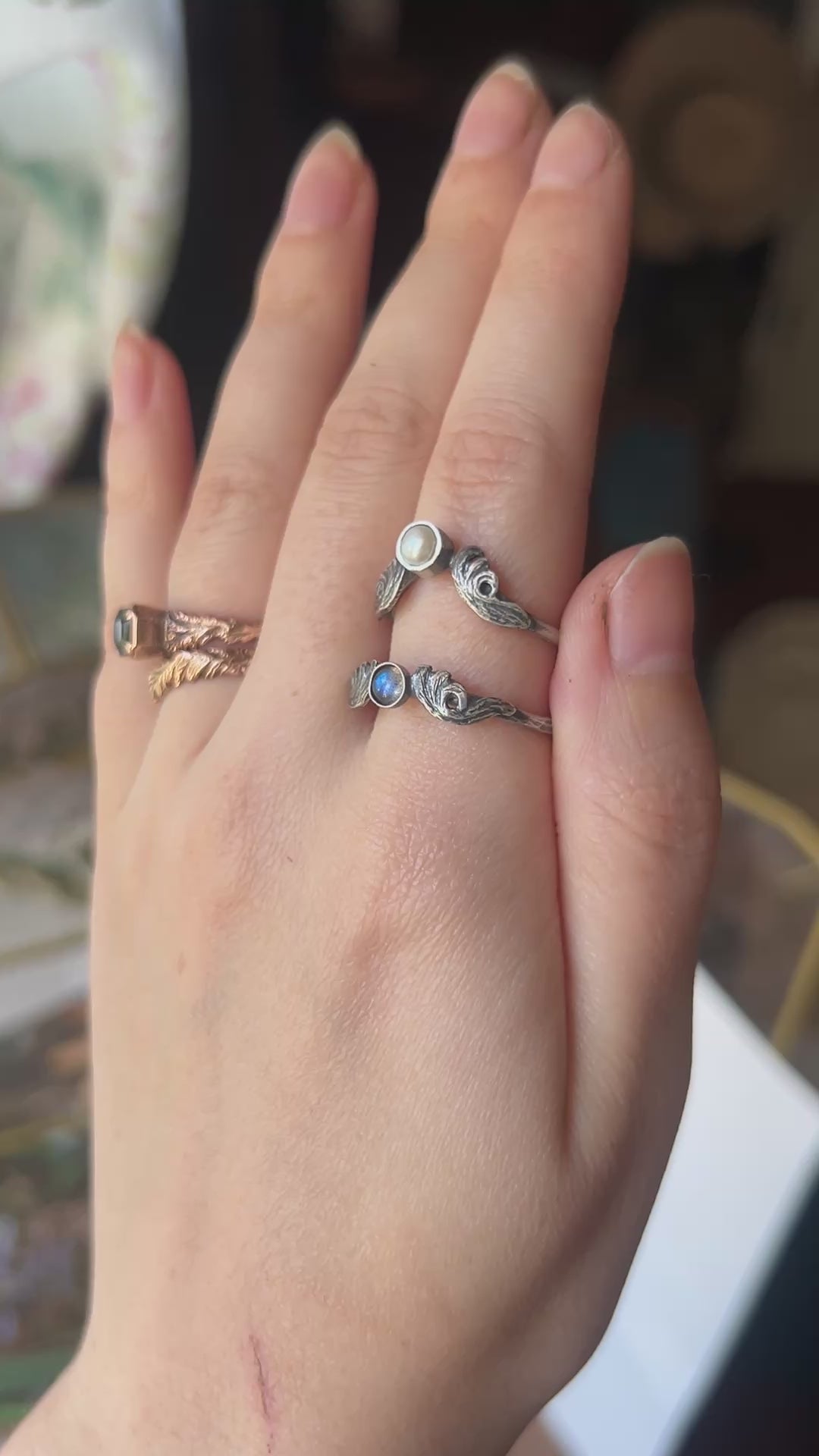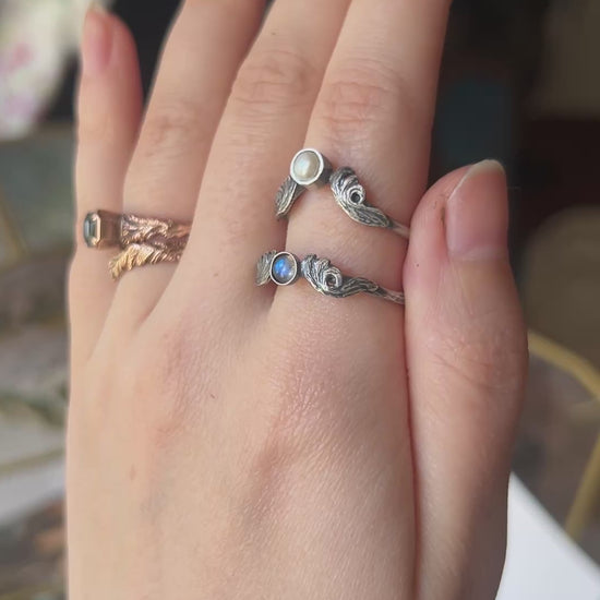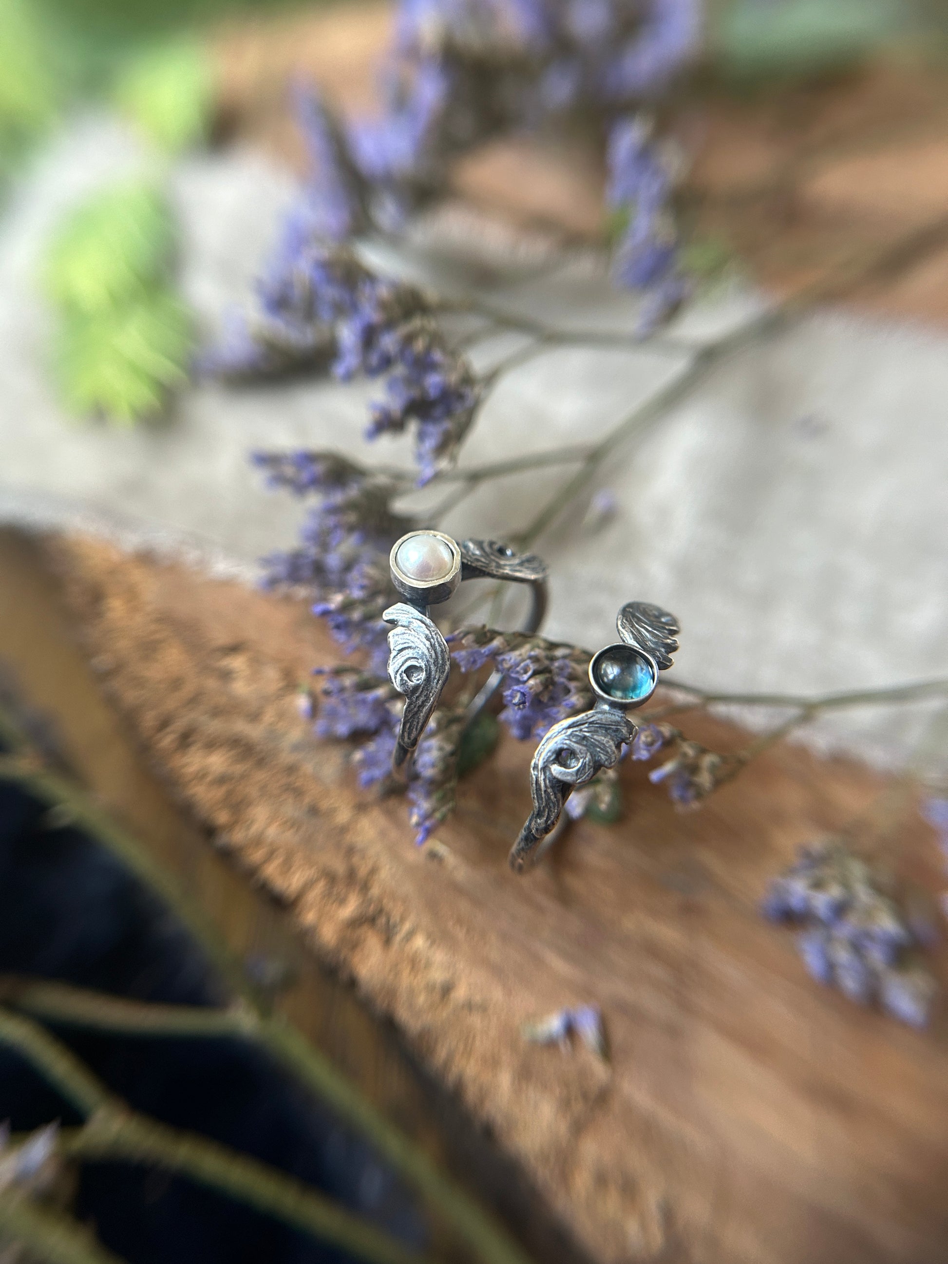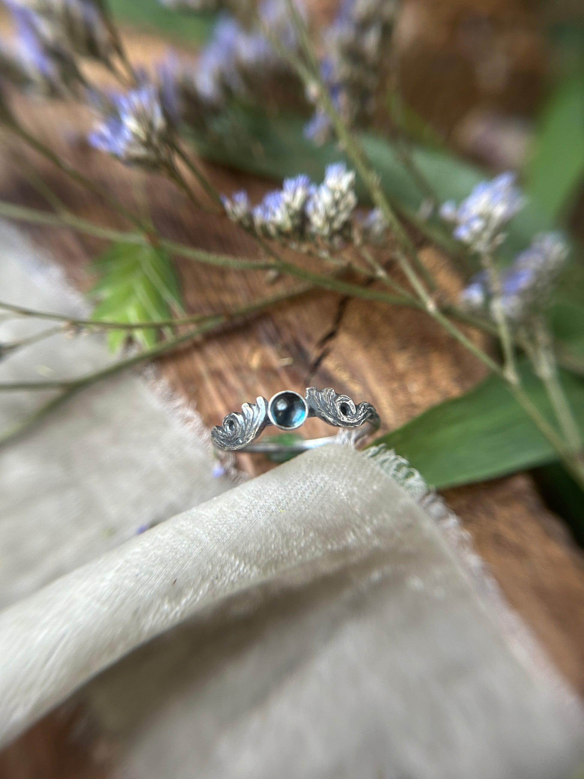 The traditional ring shape is shown with labradorite, grey moonstone, and London blue topaz(but there are other options, please reach out if you’re looking for something else)