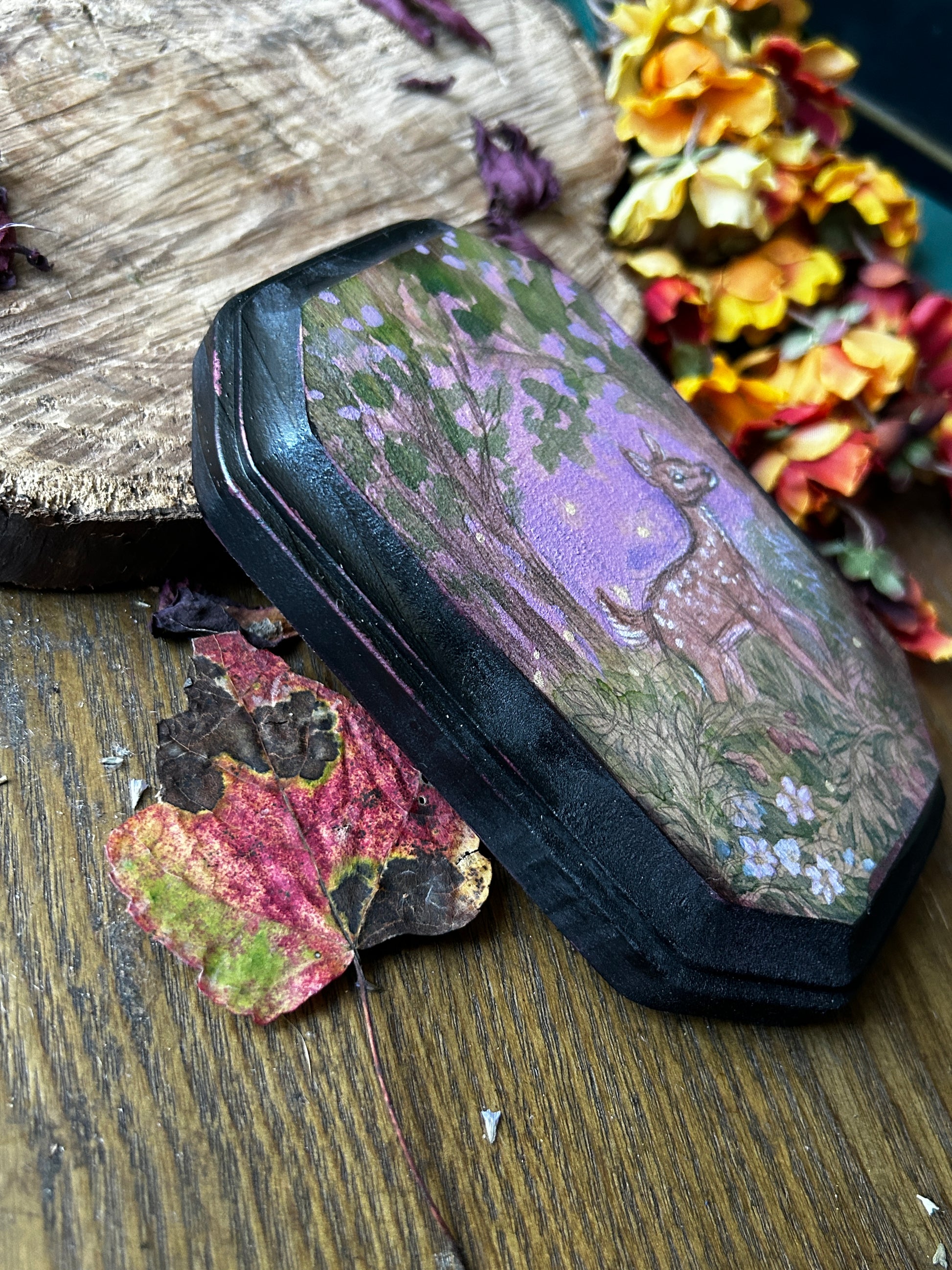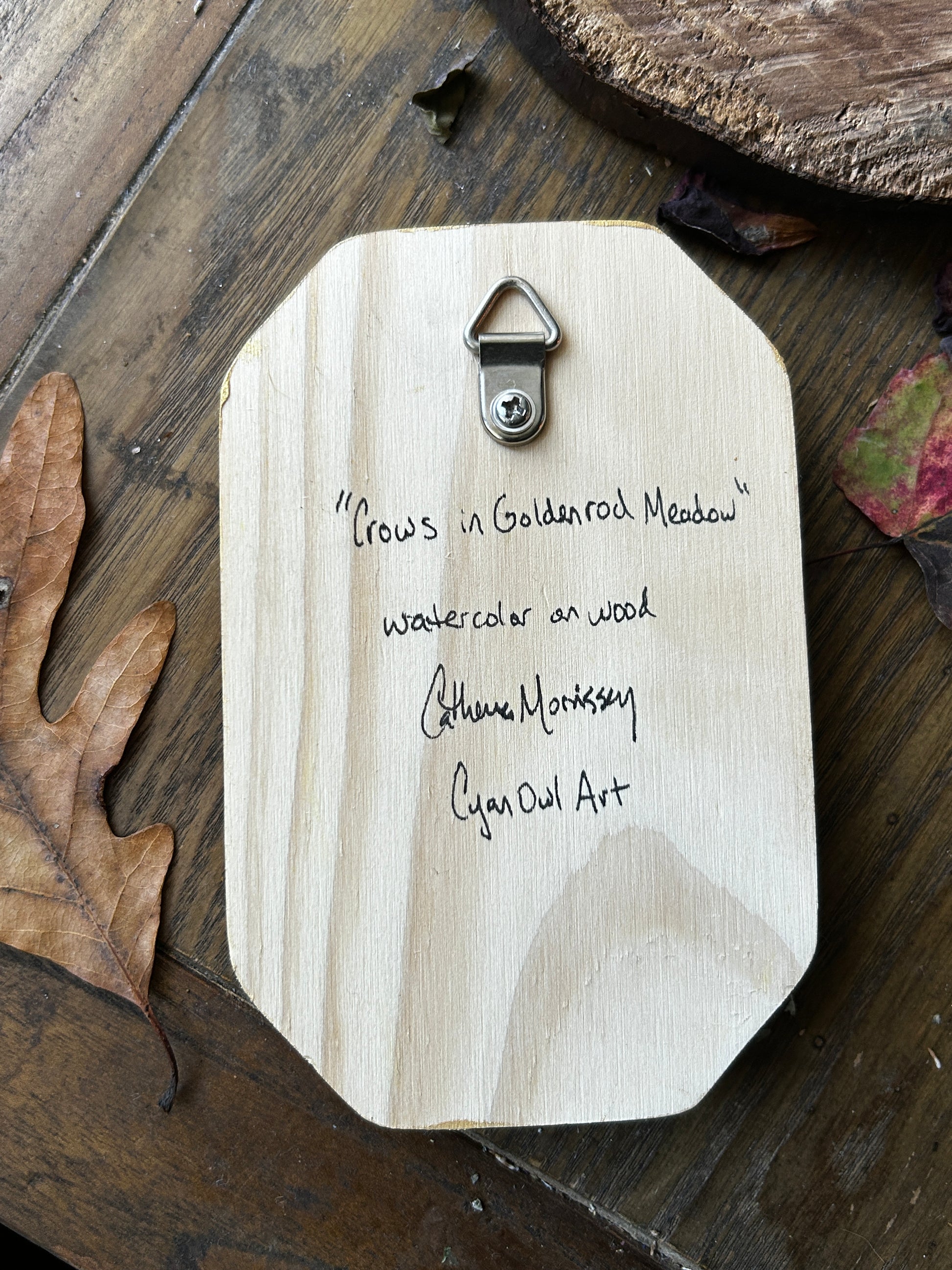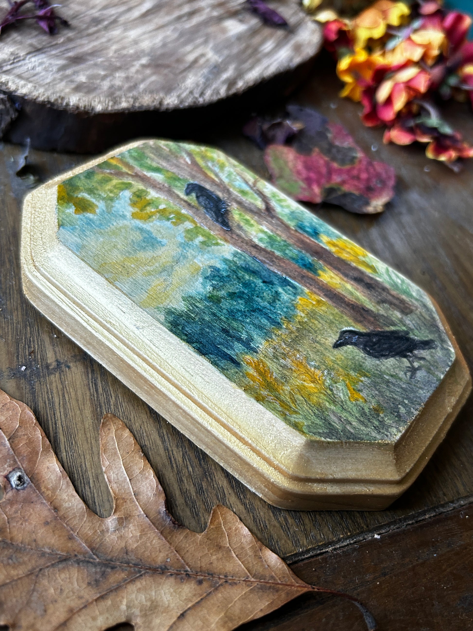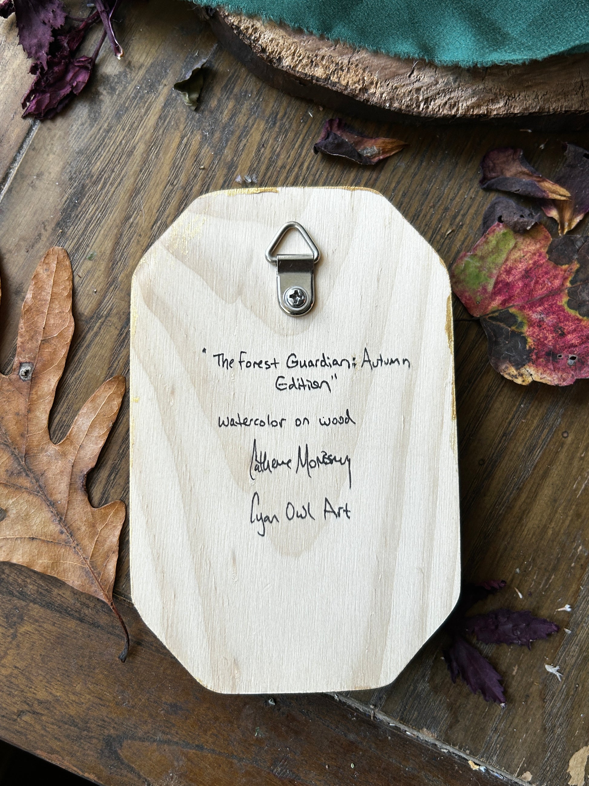 Original miniature watercolor painting on wood- ready to display art- deer fawn, barred owls, crows, autumn forest, goldenrod, blackberry bramble