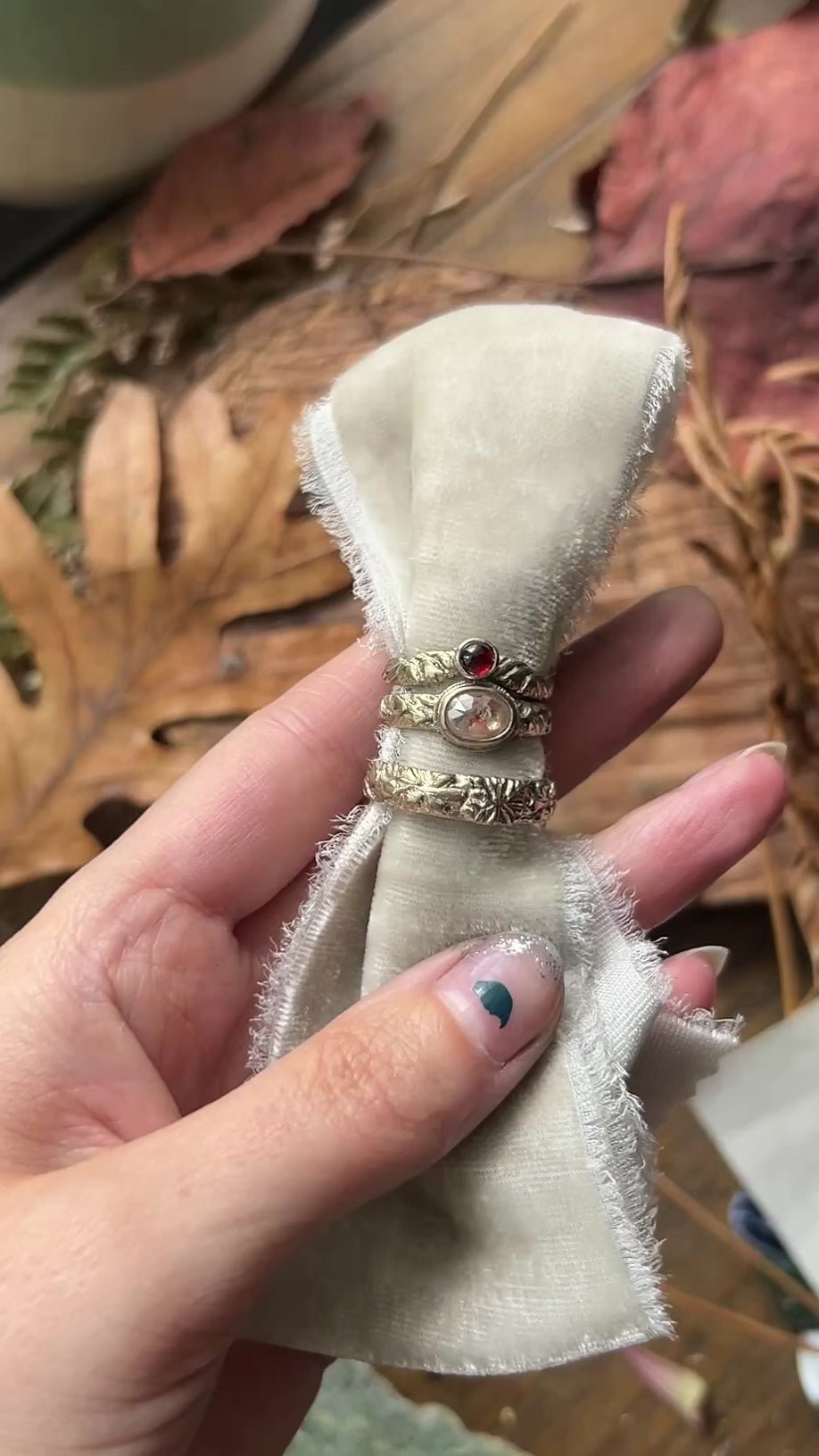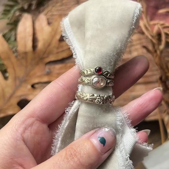 This set includes one wide band ring, one engagement ring with an already chosen diamond(starred in photo), and one wedding ring with the smaller red garnet (also starred in the photo). The chosen designs are A, B, and D circled in the design drawing.