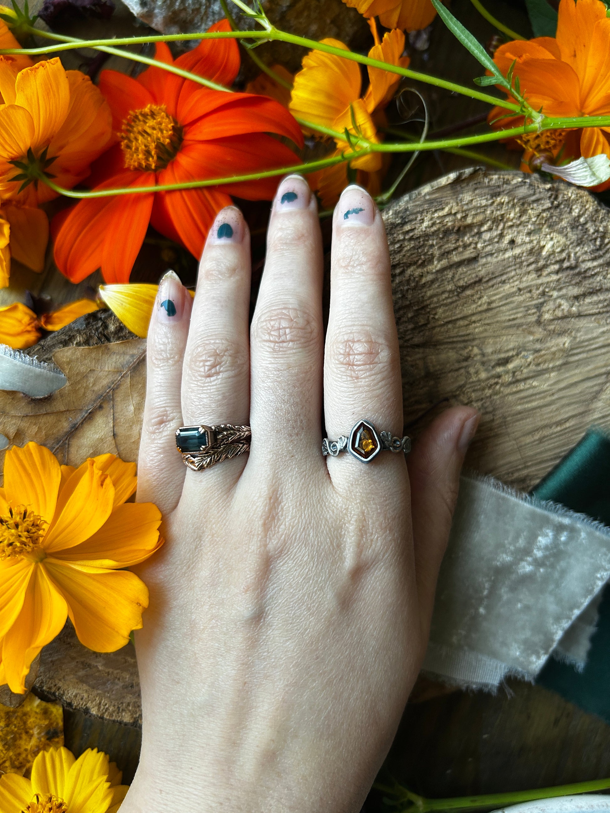 These rings are inspired by the pumpkins and jack-o-lanterns of the harvest season, for those who enjoy pumpkins and spooky season all year long. Twirling pumpkin vines decorate the ring bands, each with hand carved pumpkin leaves for detail.