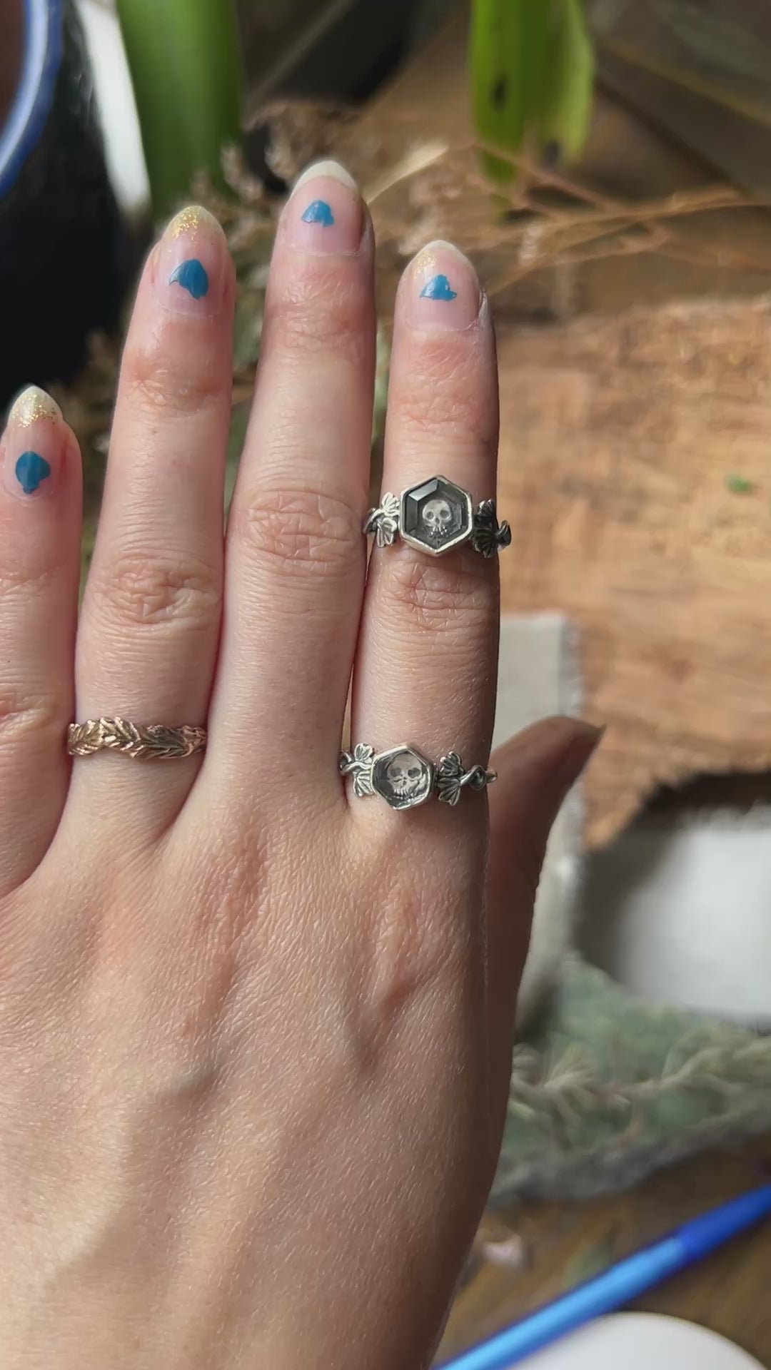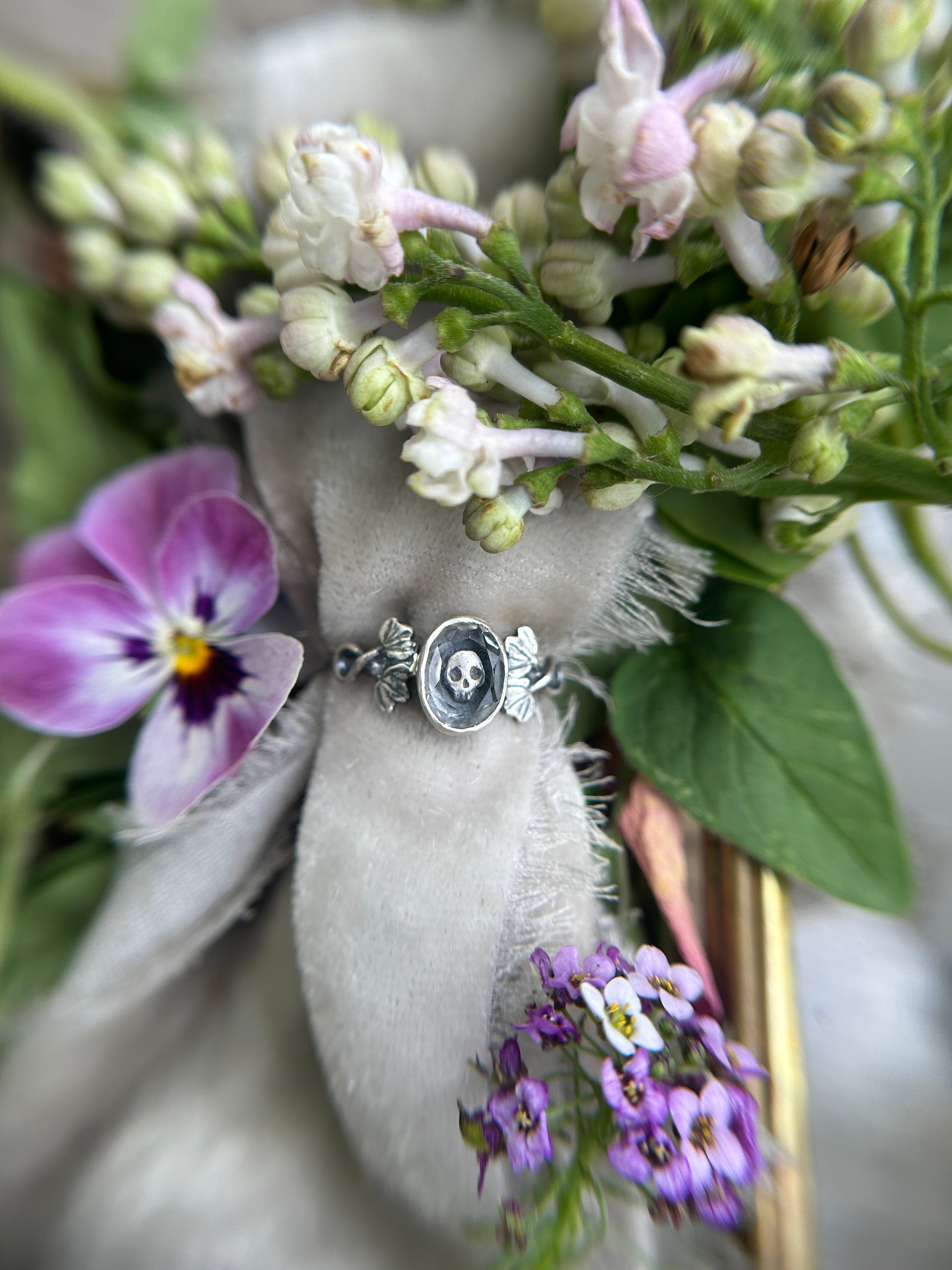 The clear quartz stone of your choosing creates a portal to the shadowy resting place of this miniature skull. I’ve oxidized the piece, but the skull gleams from under the stone. Completely handmade from the setting to the skull and ivy vines.