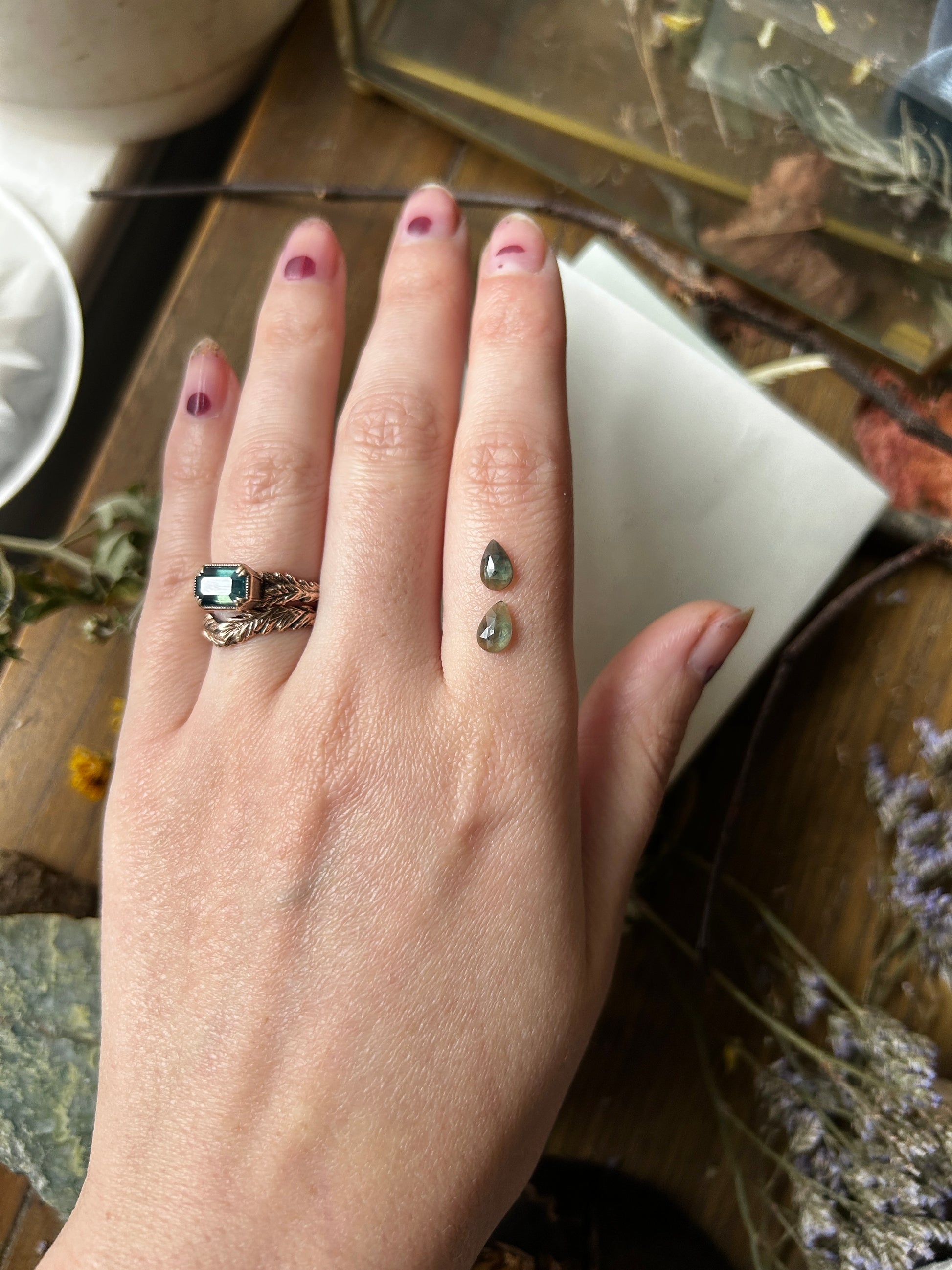 As discussed- a sterling silver ring inspired by the song of the sea ring previously made, but with a green sapphire (sapphire A) and two side stones of blue star sapphires (instead of the two sea stars/starfish).