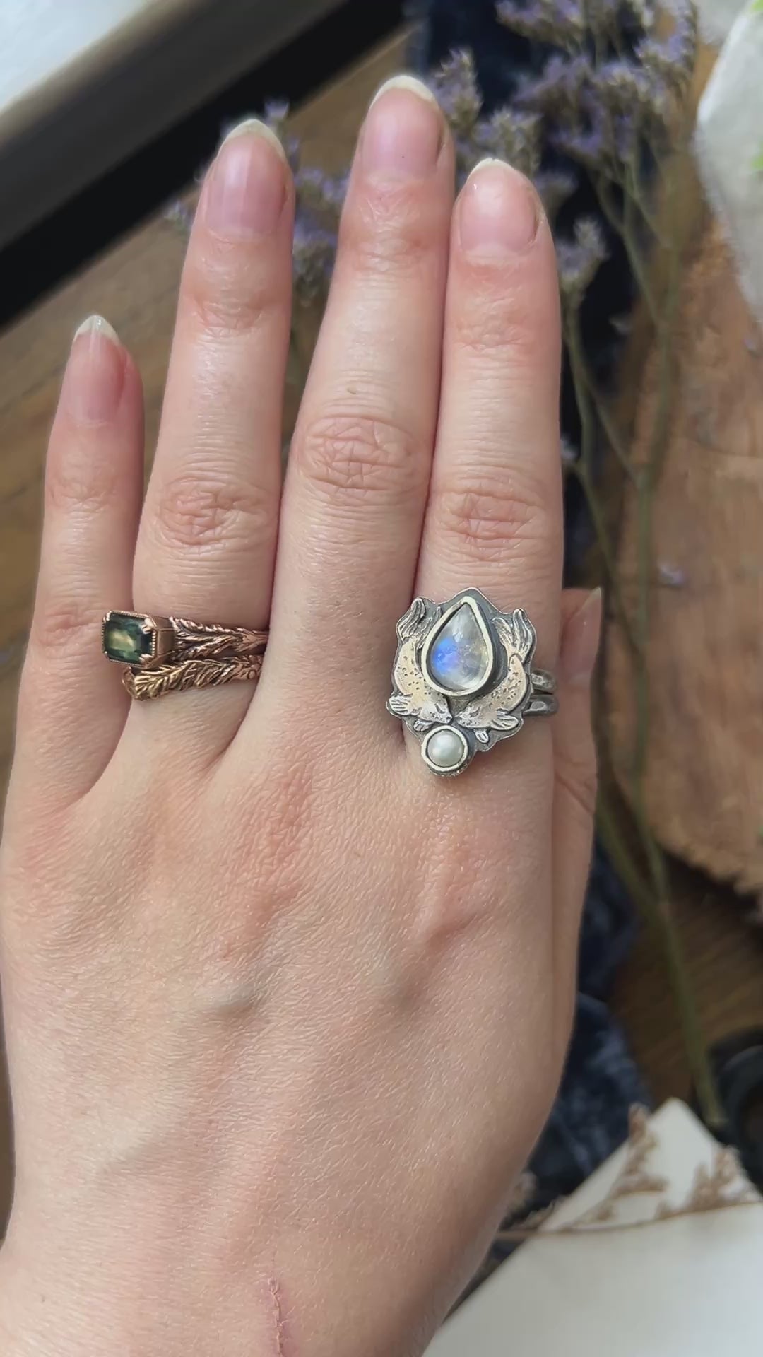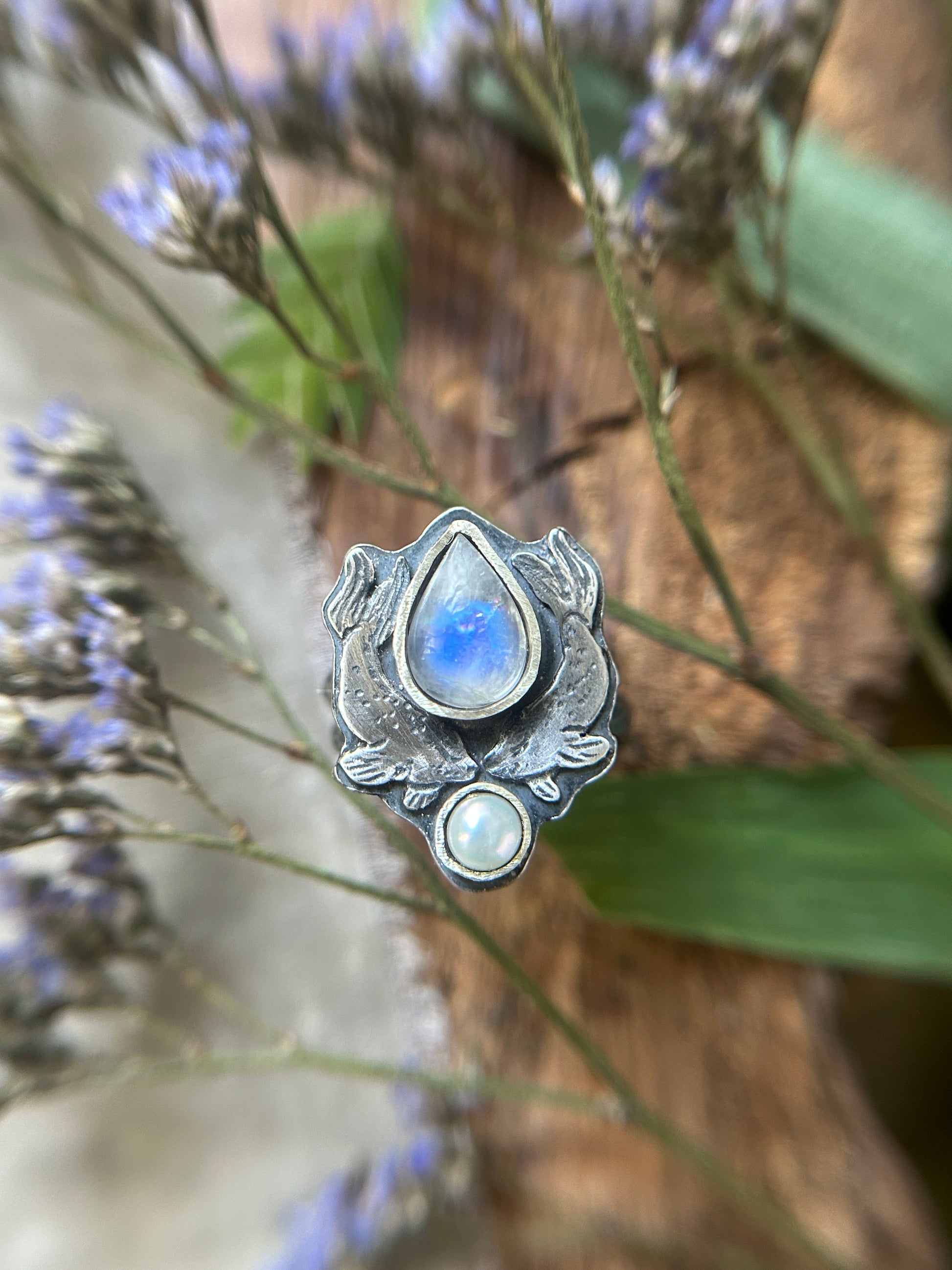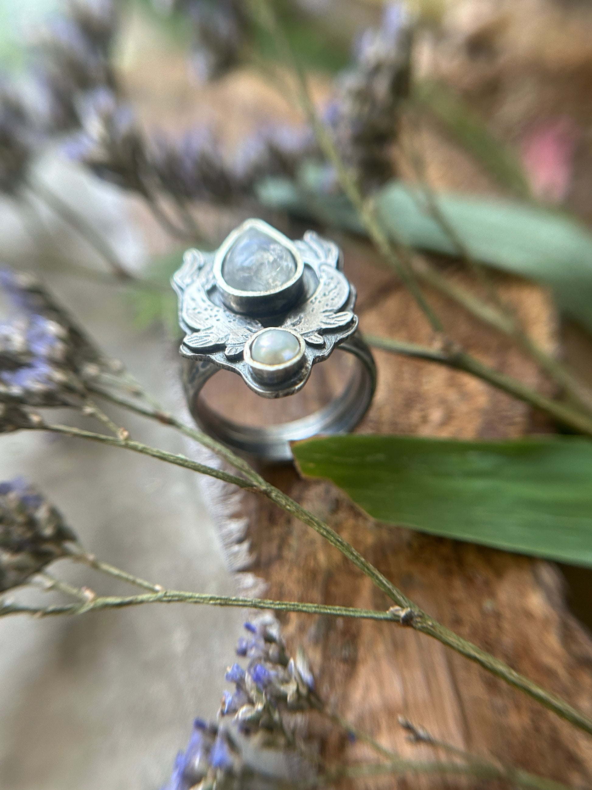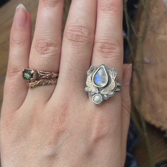 Selkie Tears Ring with Rainbow Moonstone and Pearl- sterling silver jewelry