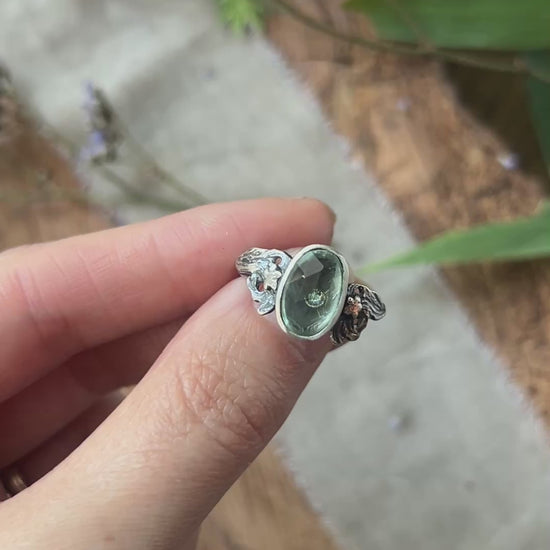 The song of the sea ring features the most stunning pale blue aquamarine. Its beauty isn't in the color specifically, it is in the extremely unique inclusions within the gem. In the off-center of the gem is a swirling circular shape that flashes in the light, as well as a few rainbow inclusions that dance through the stone depending on light.