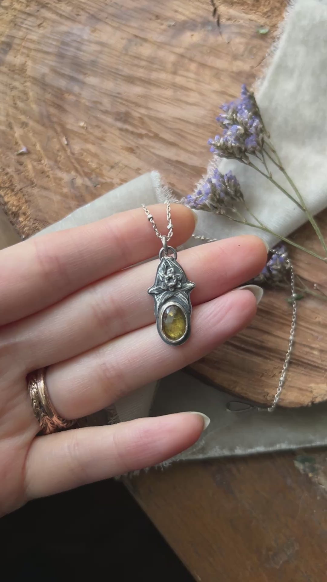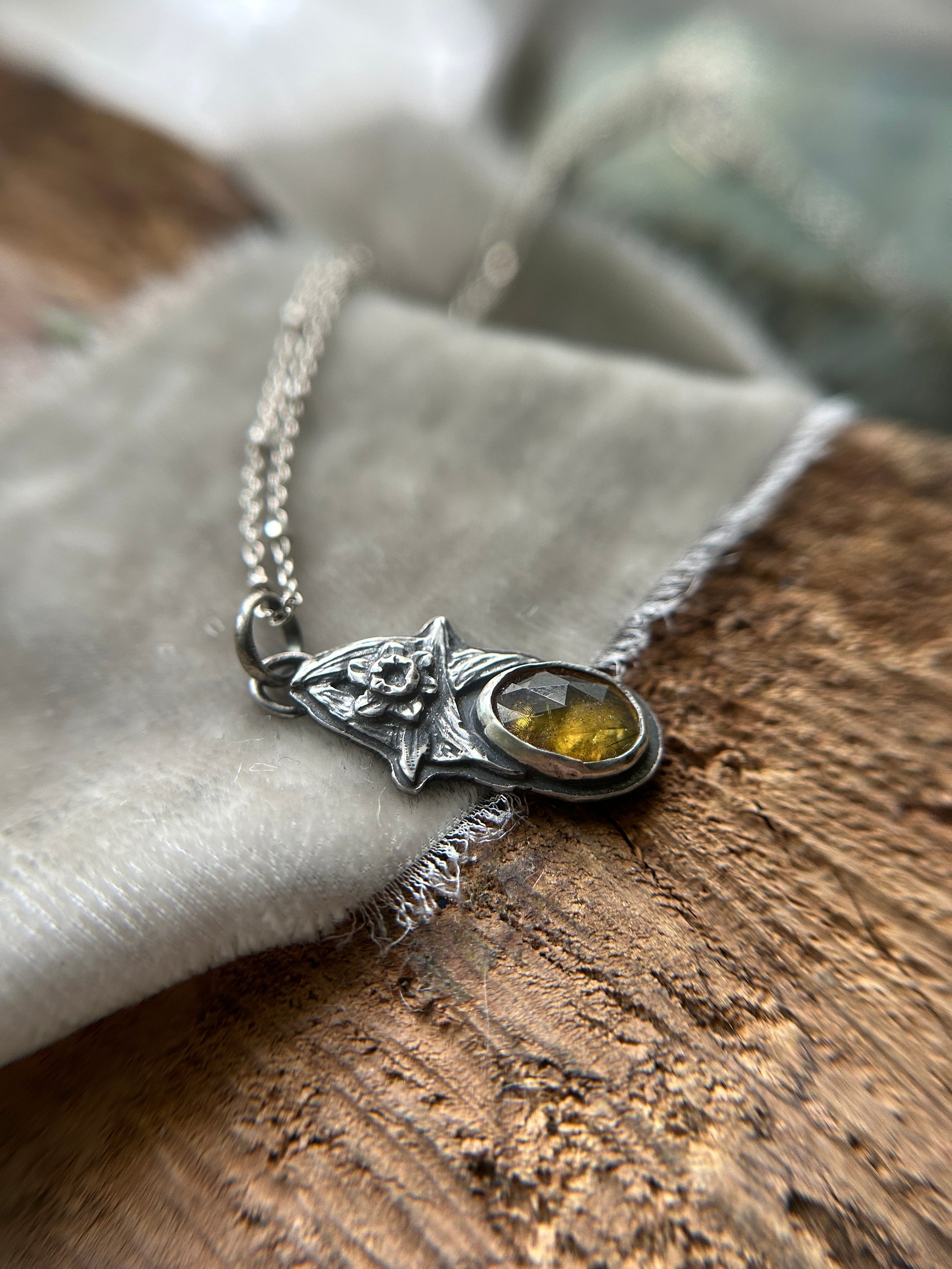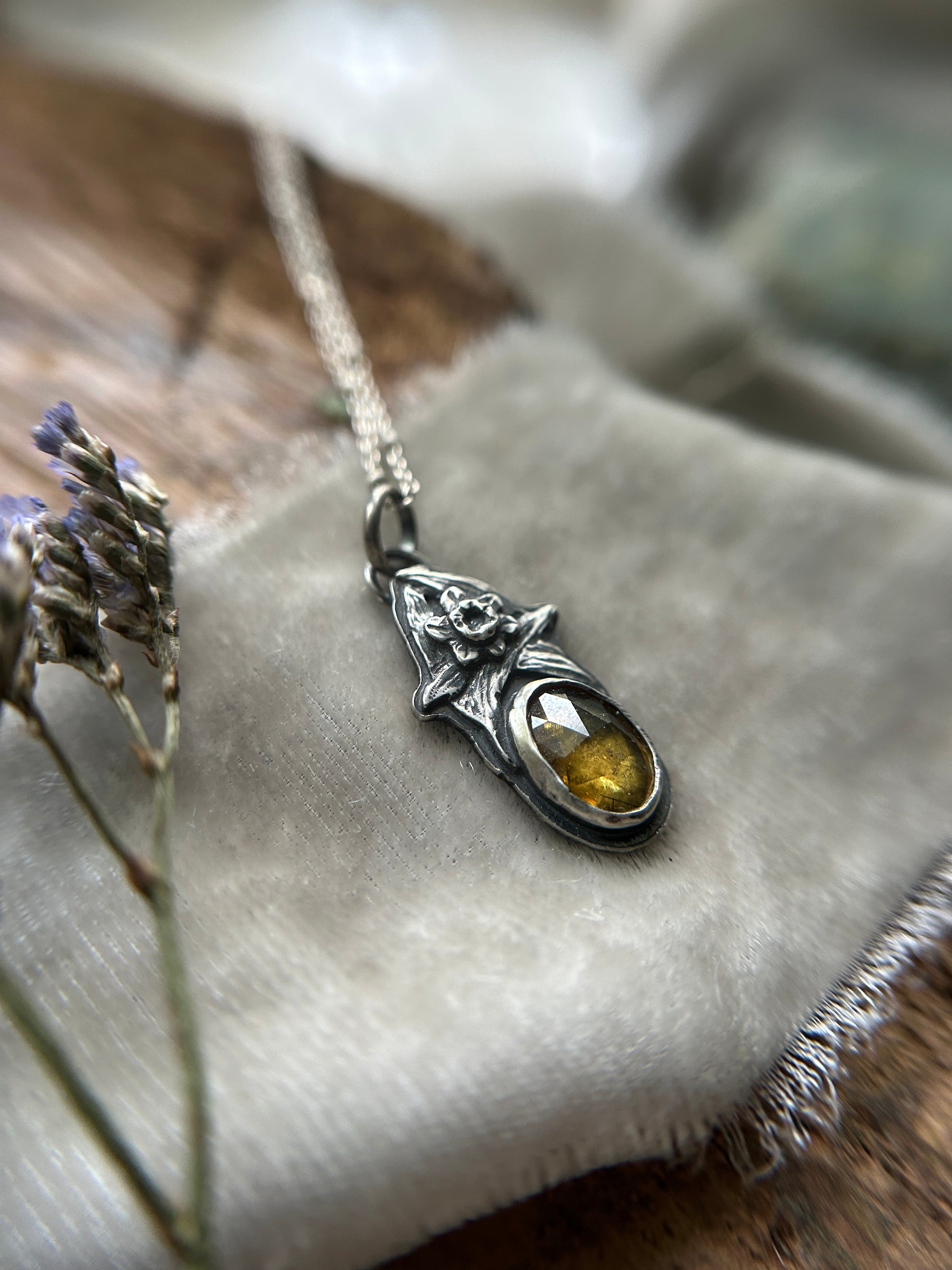 This enchanting amber hued sphene stone has some intriguing inclusions (almost tourmaline, or epidote?) but with a sun beam amber yellow hue throughout. A hand crafted sterling silver daffofill crowns the pendant, and the back features an engraved daffodil.