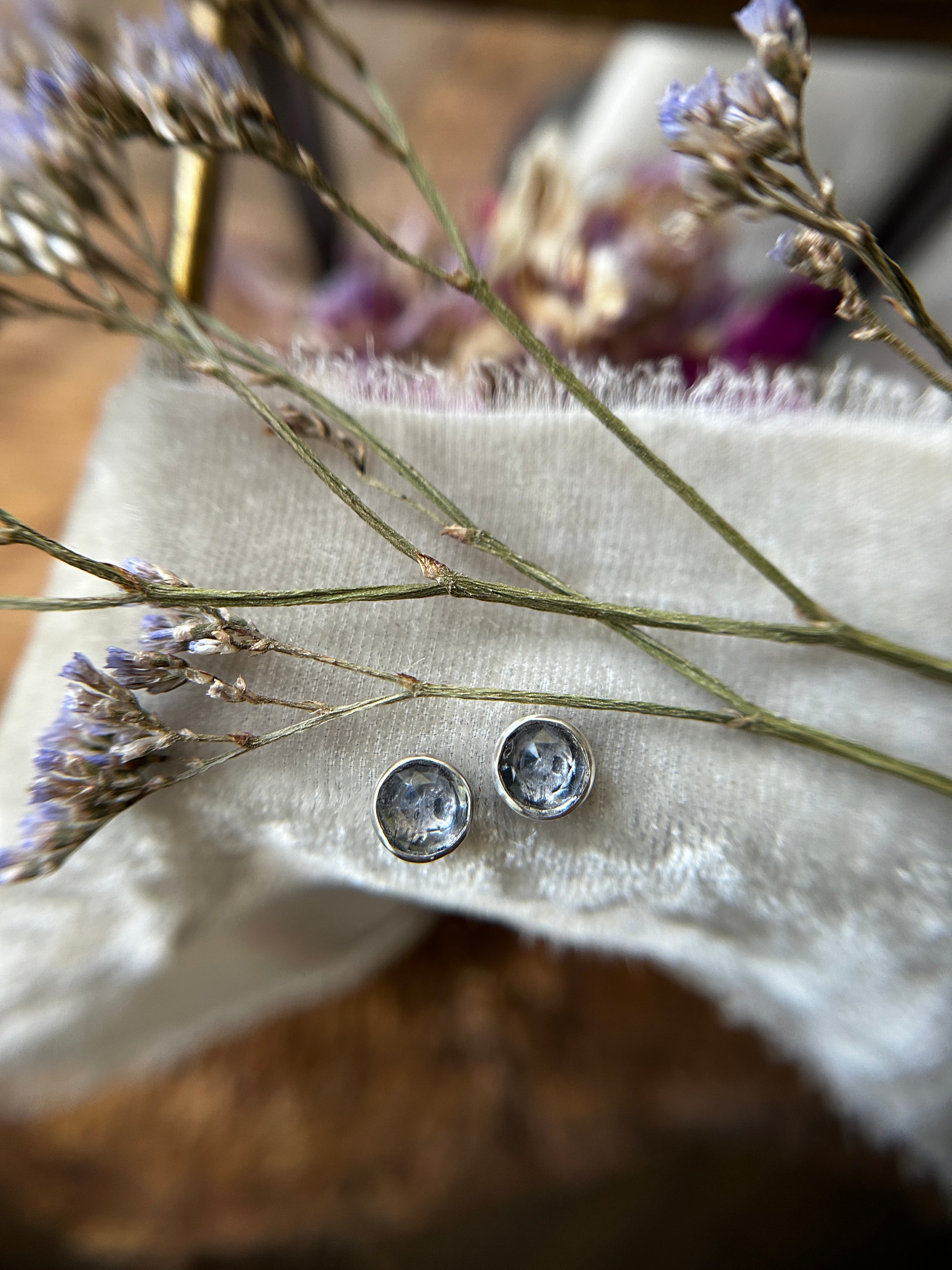 These 6mm faceted quartz stones each have a tiny skull, crafted by hand, gazing from beneath the gems like a reliquary display.